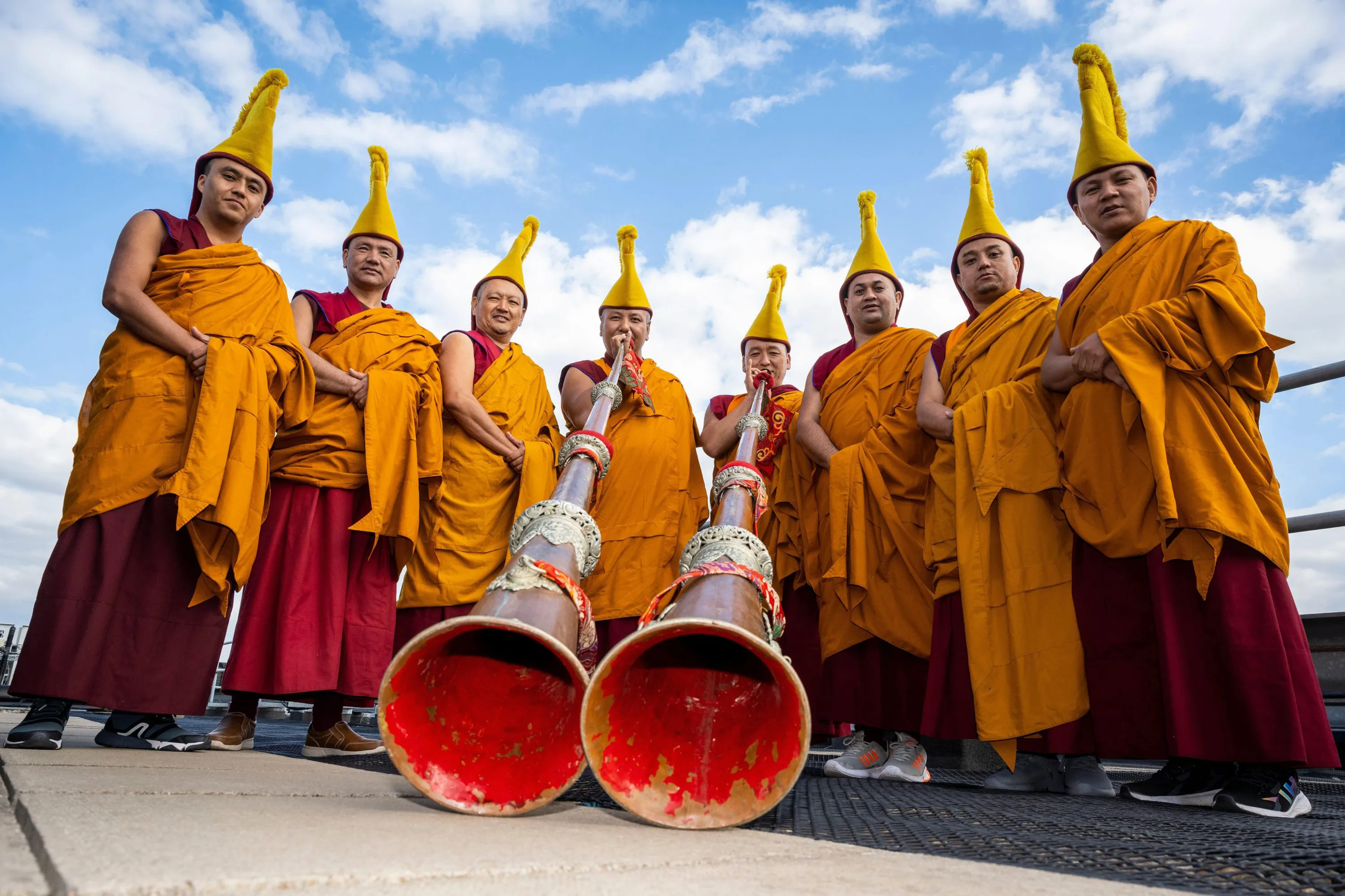 Tibetan Buddhist monks from the Tashi Lhunpo Monastery perform with ceremonial Tantric instruments (long horns) at Kings Place near King's Cross in London on April 25, 2023. ahead of the Songlines Encounters Festival on 24 May. Founded by the first Dalai Lama in 1447 in Shigatse, Central Tibet, Tashi Lhunpo is one of the most important monasteries in the Tibetan Buddhist tradition and now re-established in exile in India. (Photo by Stephen Chung/EMPICS via Alamy Live News)