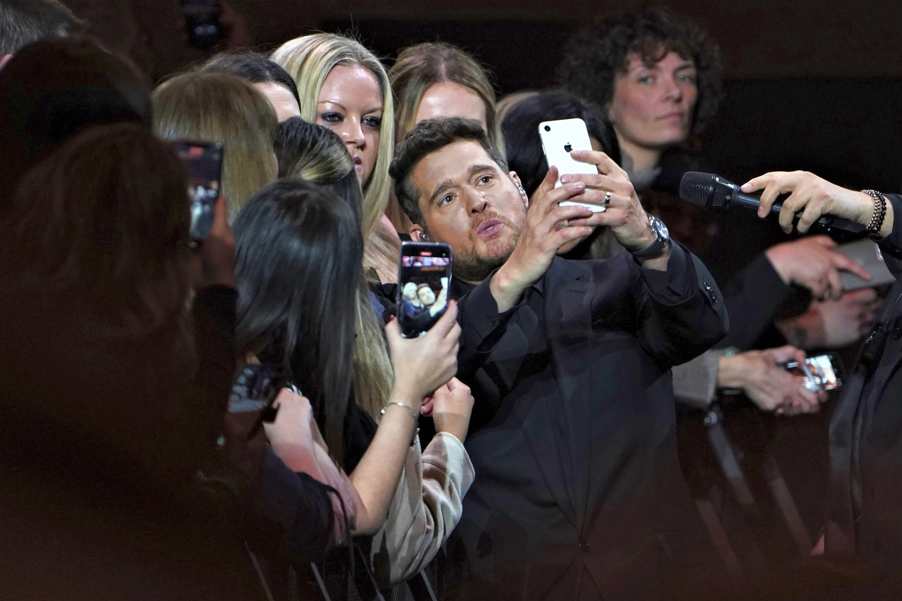 Canadian singer Michael Buble poses for a selfie as he performs on stage at the O2 Arena in London, Sunday, March 26, 2022. (Photo by Scott Garfitt/Invision/AP Photo)
