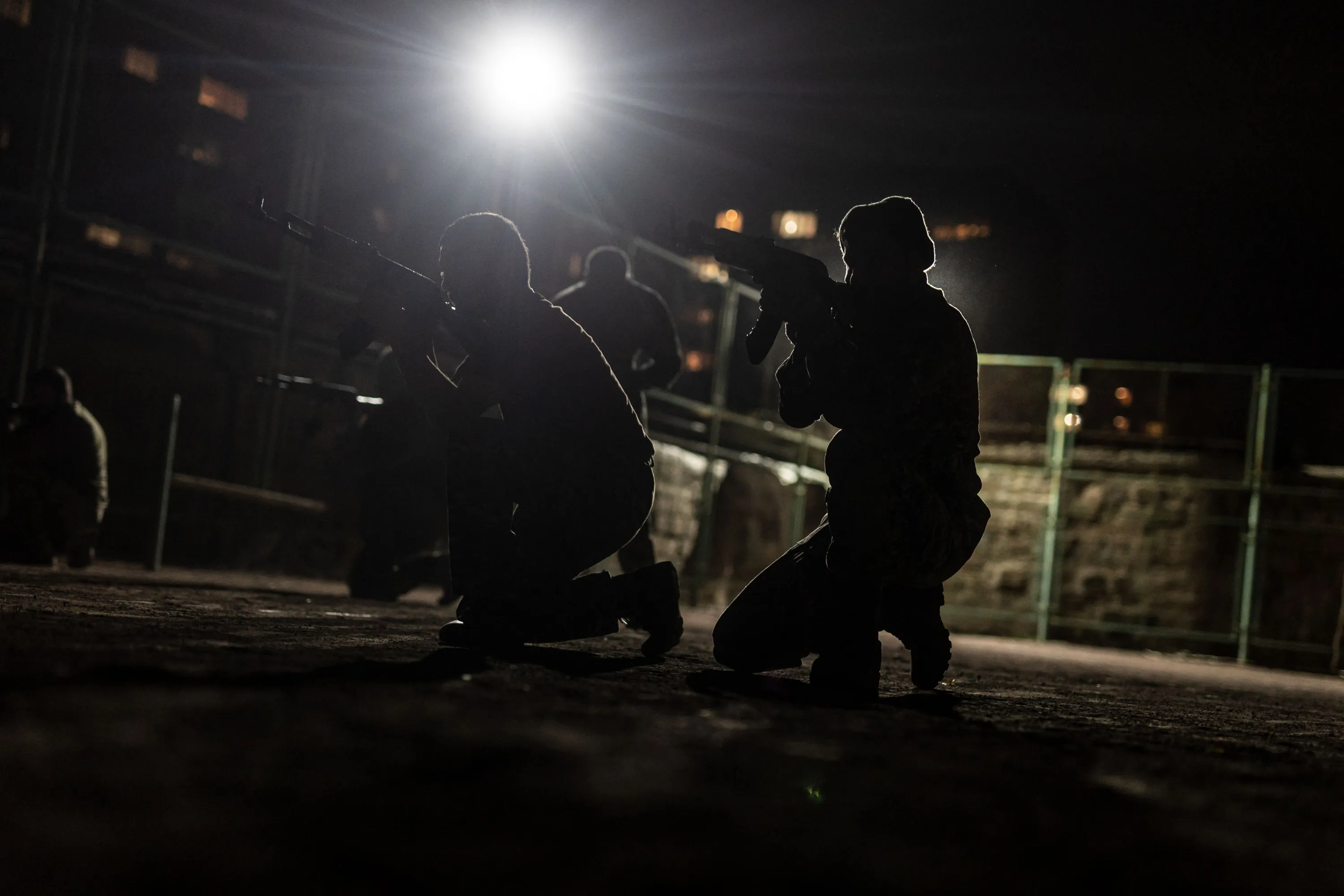 Civilians undergo a military training organised by the Armenian military school POGA at an outdoor tennis court on a street in Yerevan on October 9, 2023. The Armenian military school POGA, formed by Armenian volunteers who fought in the Nagorno-Karabakh war in 2020, provides military trainings to civilians who came voluntarily to be prepared to defend Armenia, to face the growing Azerbaijani threats on Armenian territory, following the Azeri offensive in Nagorno-Karabakh, which resulted in the displacement of the Armenian population from the territory of Nagorno-Karabakh. (Photo by Diego Herrera Carcedo/AFP Photo)