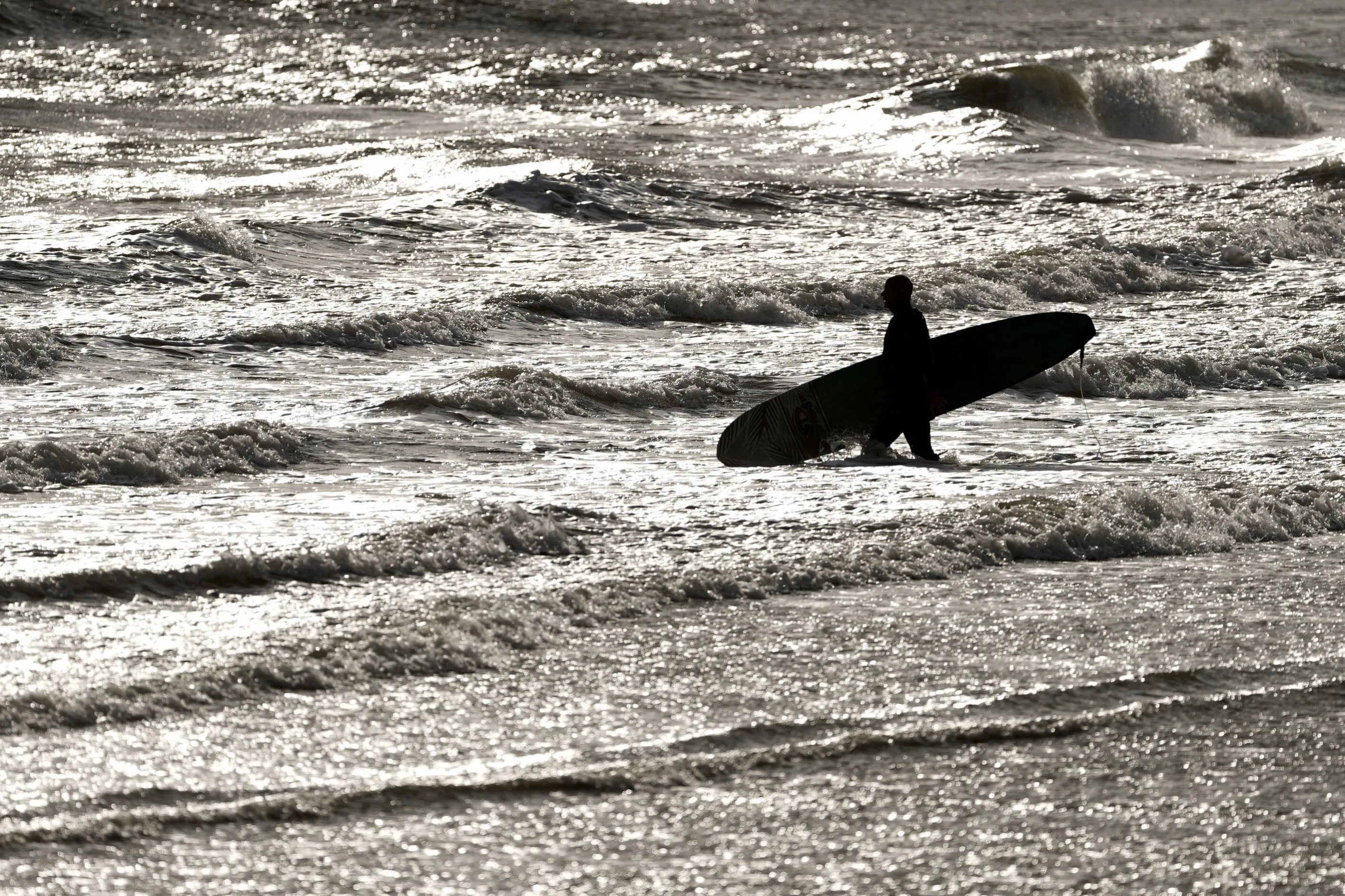 A man carries a surfboard at Sandy Bay in Porthcawl, Wales, Tuesday, September 26, 2023. Strong winds and heavy rain are set to batter the UK as Storm Agnes sweeps across the country. Agnes, the first named storm of the season, will affect western regions of the UK and Ireland on Wednesday, with the most powerful winds expected on the Irish Sea coasts. (Photo by Joe Giddens/PA Wire via AP Photo)