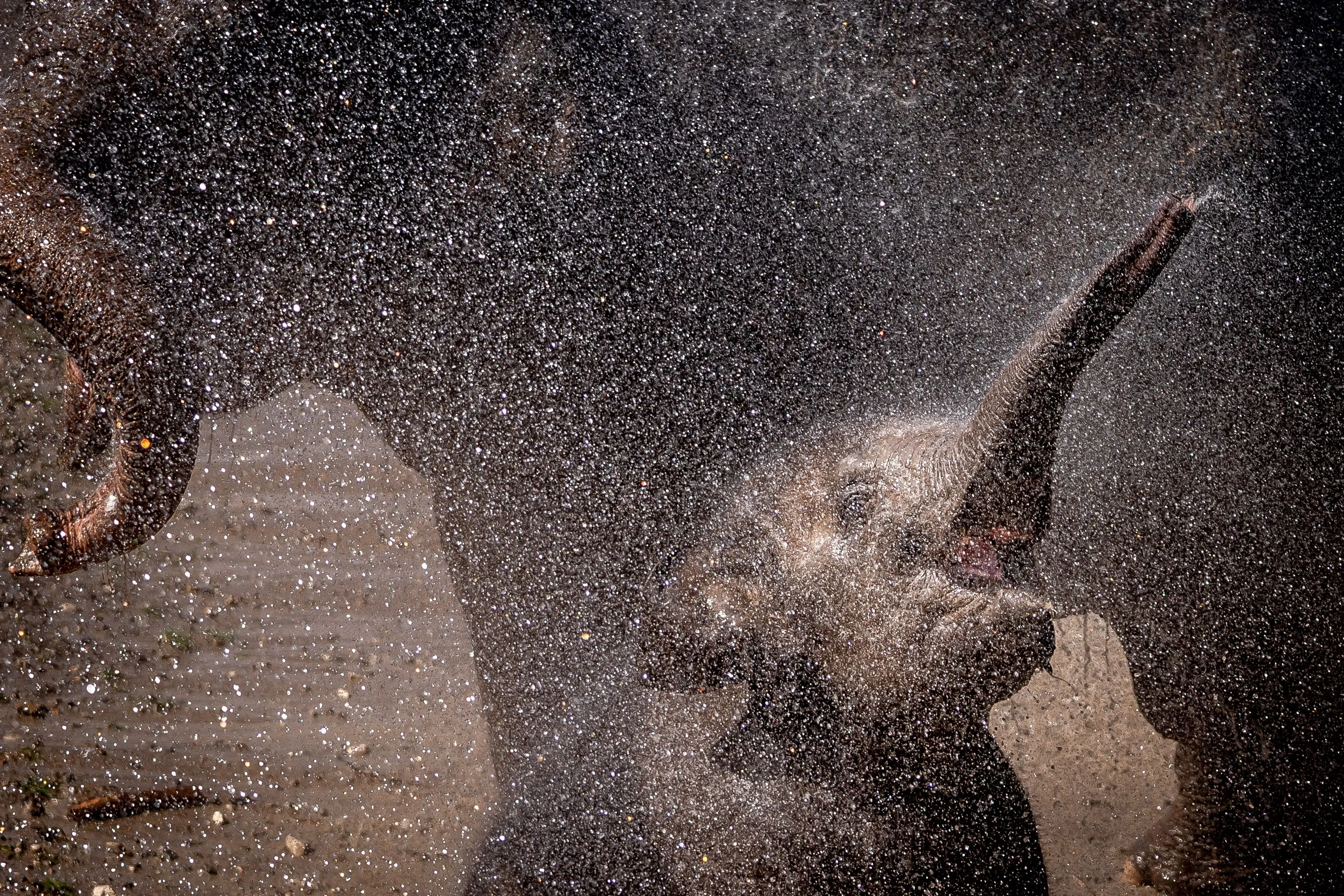 Elephants react as water is sprayed to cool them down while the outside temperatures have reached 30 degrees celcius on July 20, 2022, in a zoo in Copenhagen, Denmark. (Photo by Mads Claus Rasmussen/Ritzau Scanpix via AFP Photo)