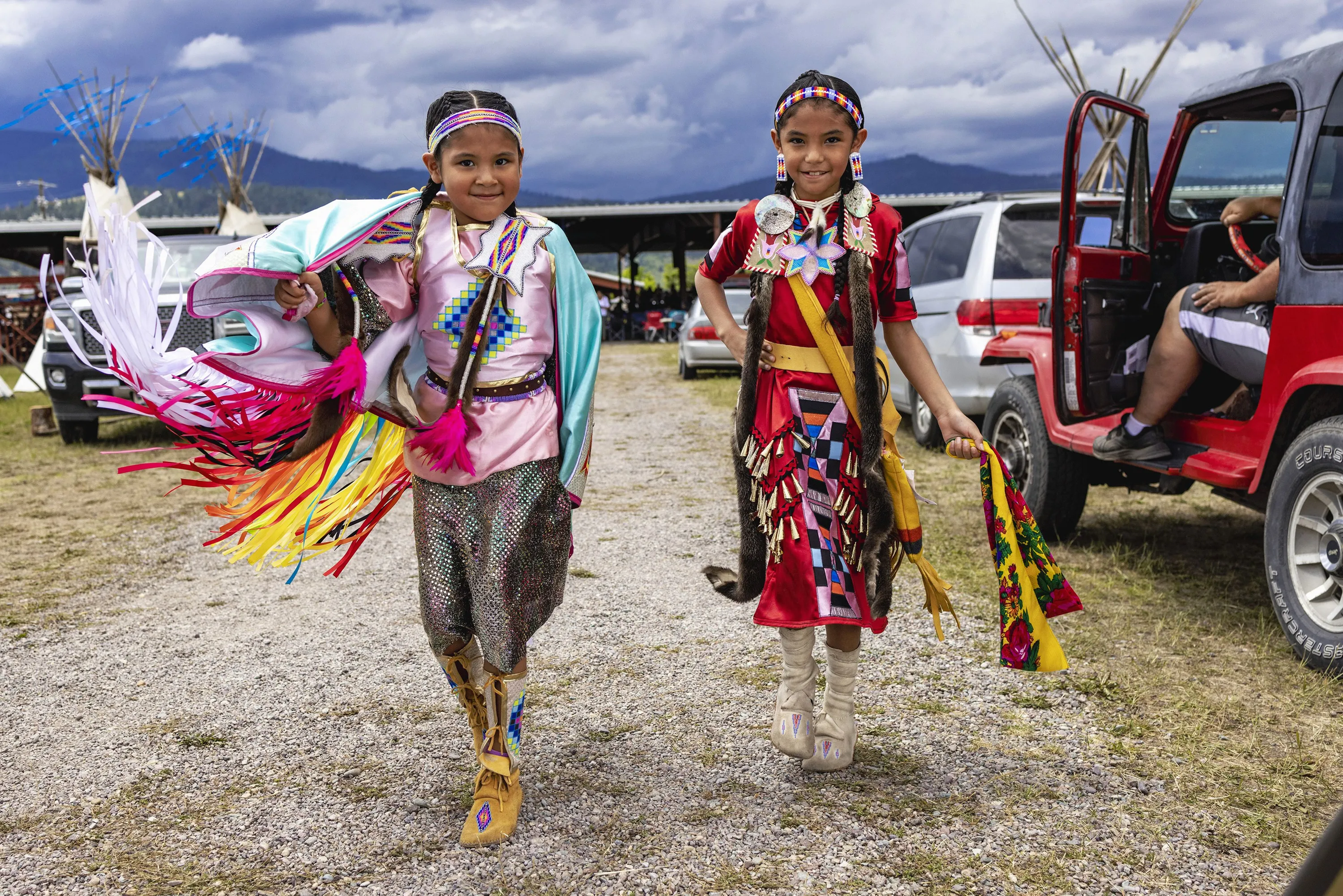 The dancers Harmony Kickingwoman, 6, left, and Braylin Kickingwoman, 7, whose family travels every weekend from April to September to compete at powwows, at the 122nd annual Arlee Celebration powwow in Arlee, Mont., July 4, 2022. The celebration – a mix of dance and drum competitions, traditional ceremonies and games – serves as a space for multiple tribes to compete, eat traditional foods and visit with relatives and old friends. (Photo by Tailyr Irvine/The New York Times)