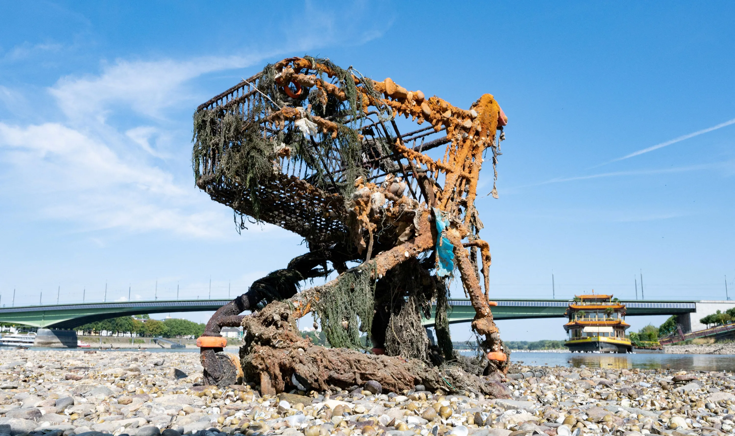 A rusted shopping cart is seen on a sandbank in the Rhine exposed by the low tide in Bonn, Germany on August 16, 2022. (Photo by Benjamin Westhoff/Reuters)