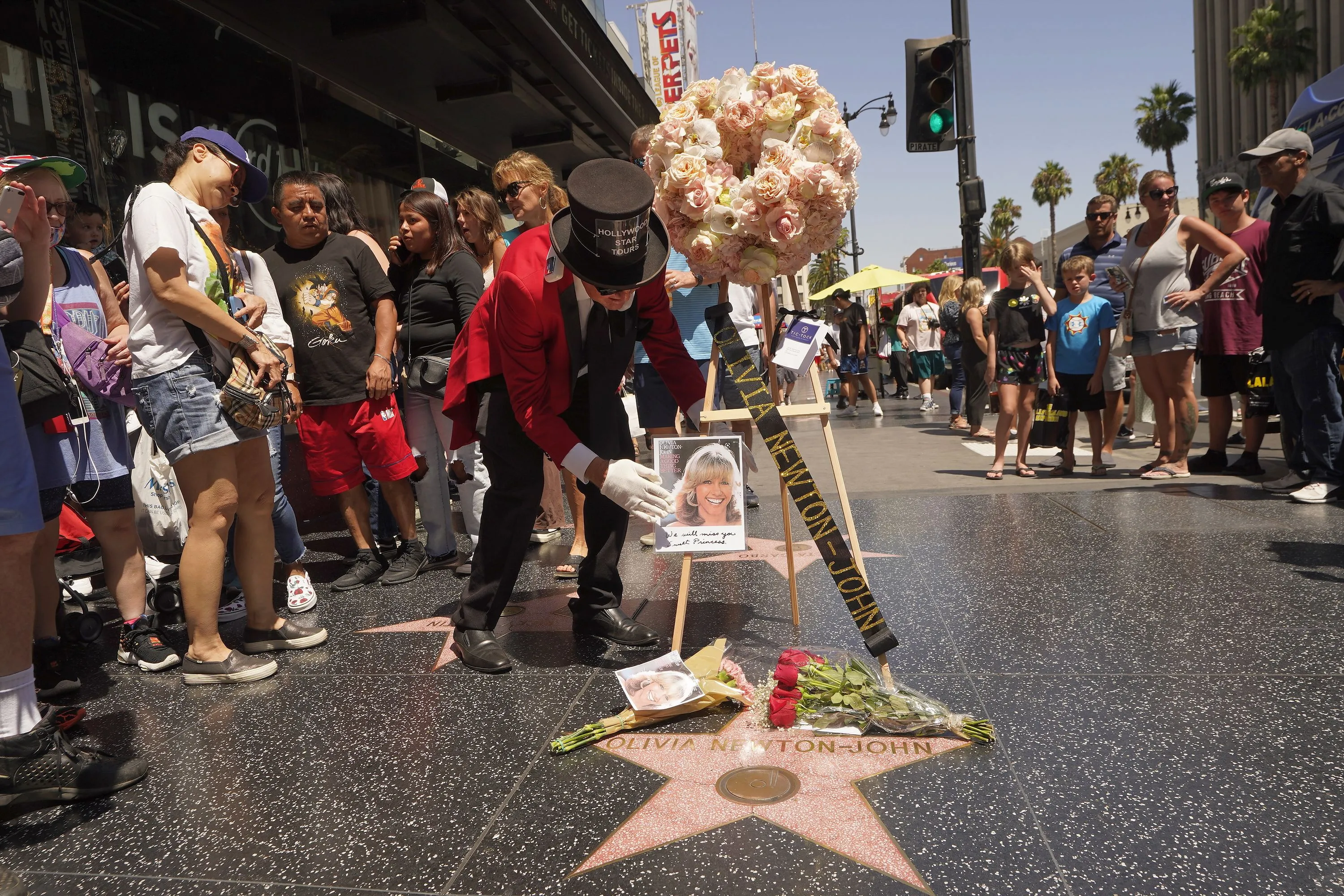 Gregg Donovan, middle, former ambassador of Beverly Hills Fans, honors actor Olivia Newton-John with flowers on her Hollywood Walk of Fame star in Los Angeles, Monday, August 8, 2022. Olivia Newton-John, the Grammy-winning superstar who reigned on pop, country, adult contemporary and dance charts with such hits as “Physical” and “You're the One That I Want” has died. She was 73. (Photo by Damian Dovarganes/AP Photo)