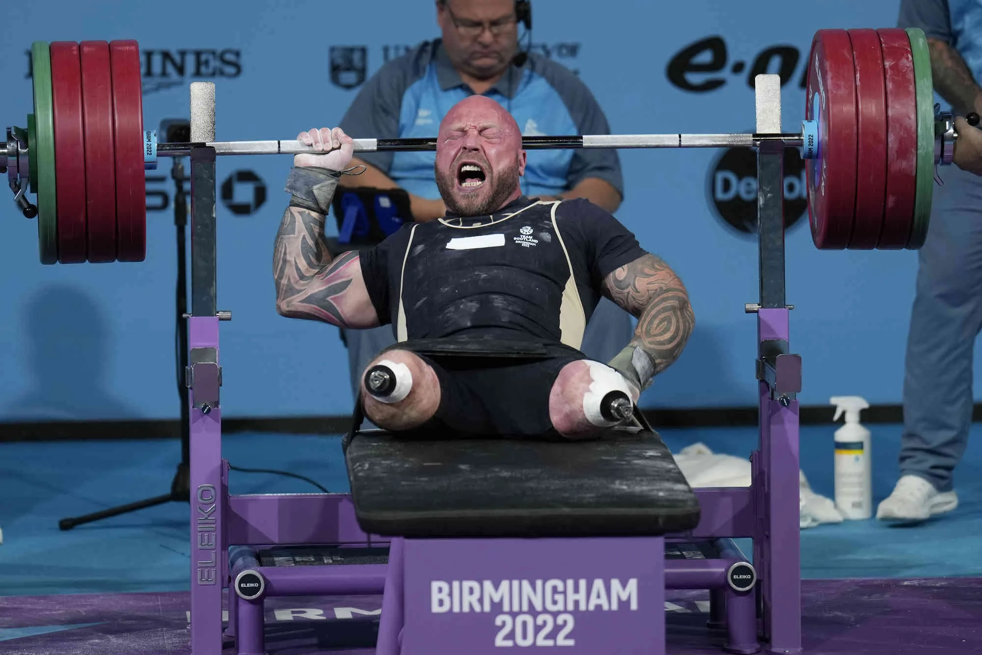 Scotland's Micky Yule reacts after a successful lift during the men's heavyweight para powerlifting final at the Commonwealth Games at The NEC in Birmingham, England, Thursday, August 4, 2022. (Photo by Aijaz Rahi/AP Photo)