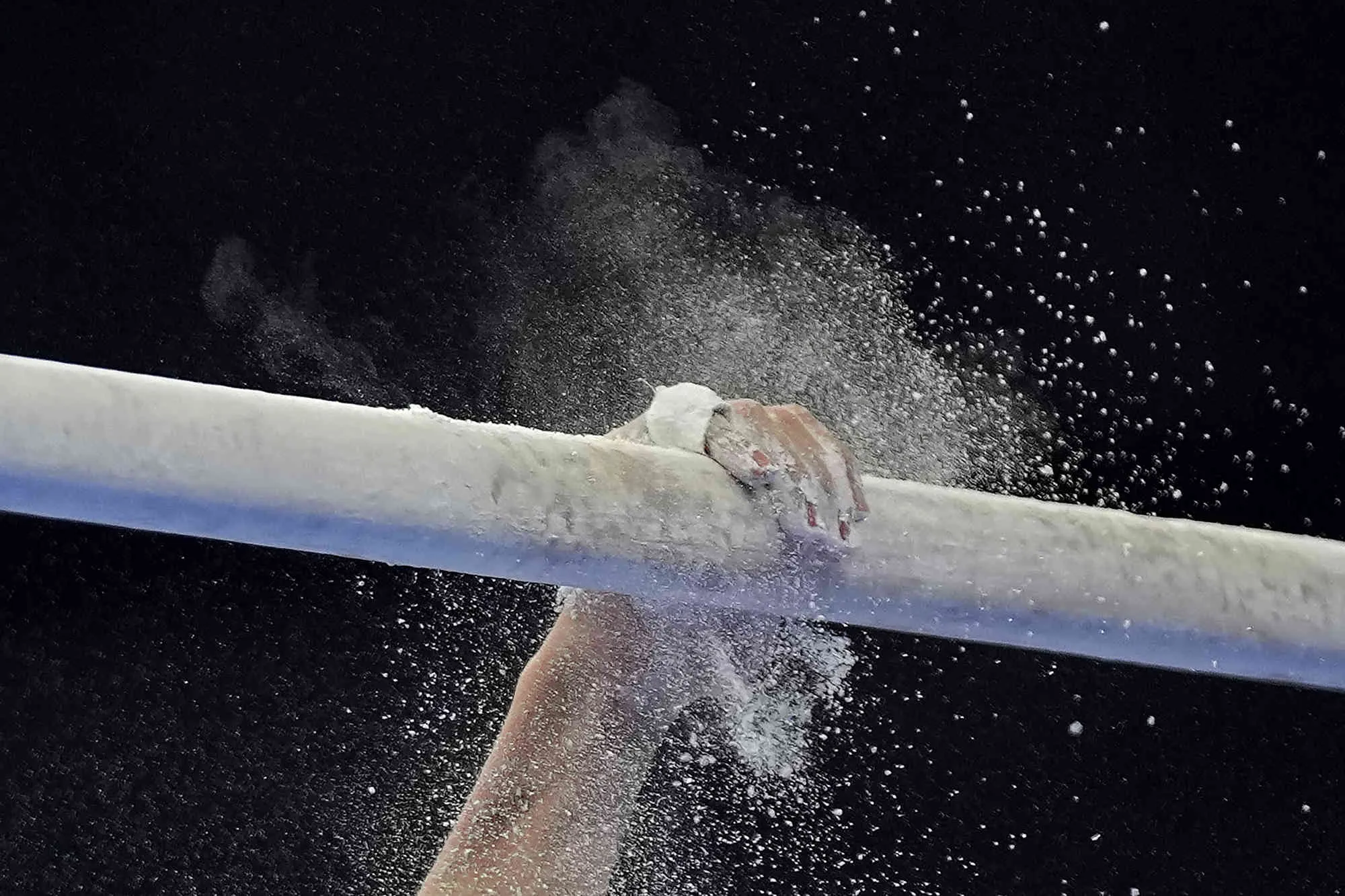 China's Boheng Zhang applies powder on the bar before competing in the Artistic Gymnastics men's parallel bars final at 19th Asian Games in Hangzhou, China, Friday, September 29, 2023. (Photo by Aijaz Rahi/AP Photo)