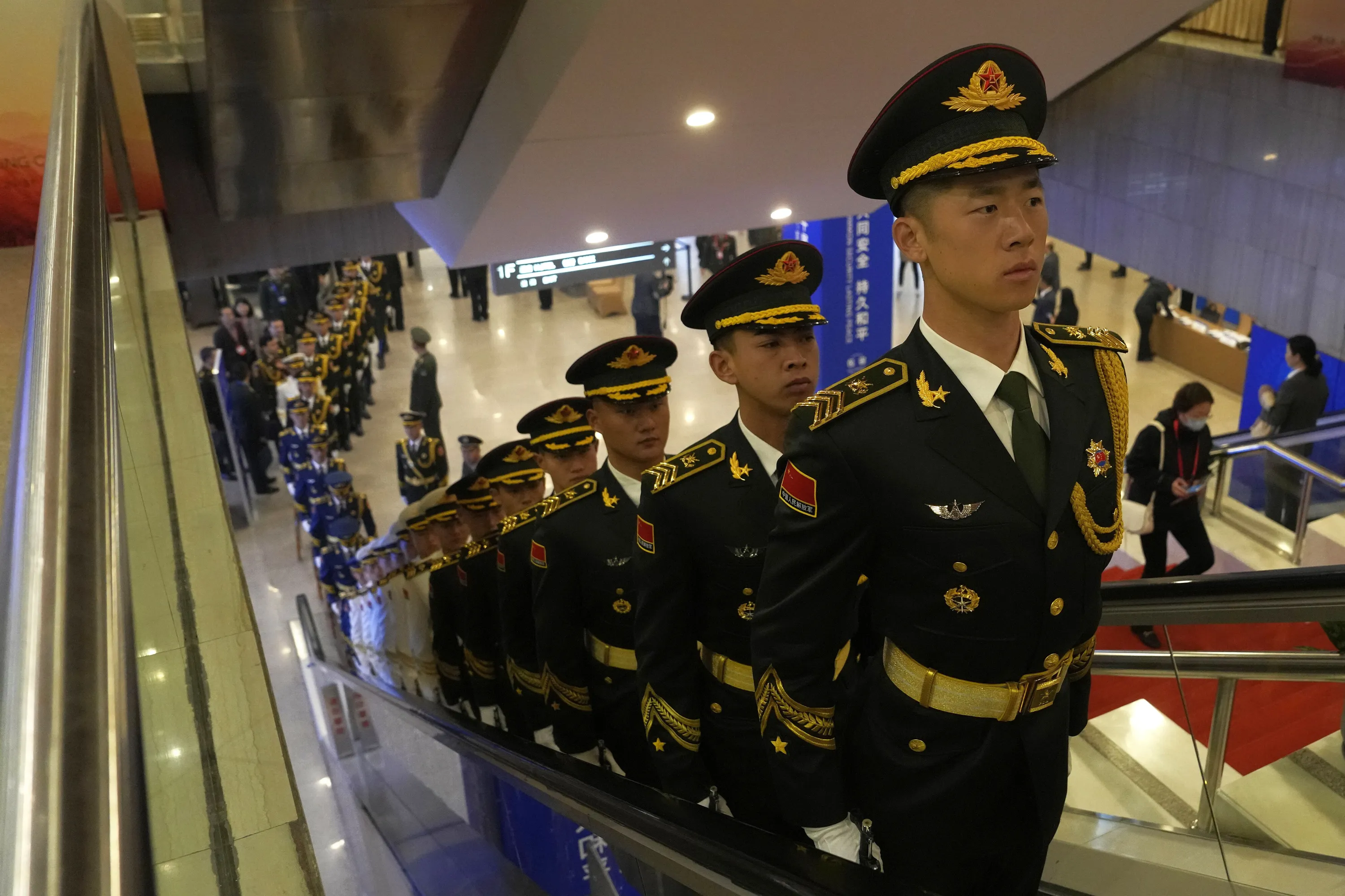 Members of a Chinese honor guard ride an escalator at the 10th Beijing Xiangshan Forum held in Beijing, Monday, October 30, 2023. The Beijing event, attended by military representatives from dozens of countries, is an occasion for China to project regional leadership and boost military cooperation. (Photo by Ng Han Guan/AP Photo)