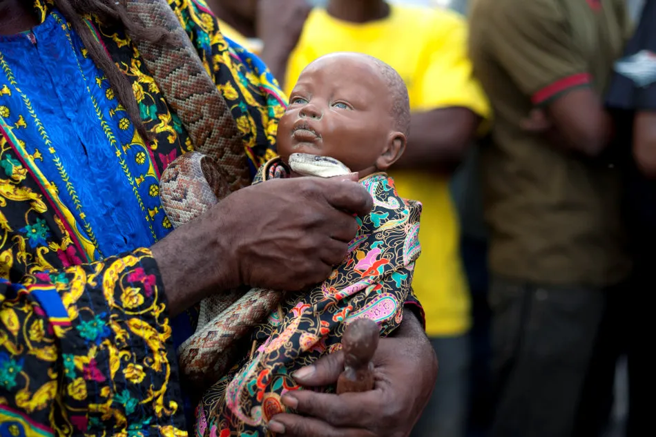 In this Jan. 27, 2013 photo, an assistant of snake handler Saintilus Resilus holds a doll as part of a snake performance during pre-Lenten Carnival celebrations in Petionville, Haiti. Resilus has used snakes and other animals to earn a little money since at least 1974. (AP Photo/Dieu Nalio Chery)