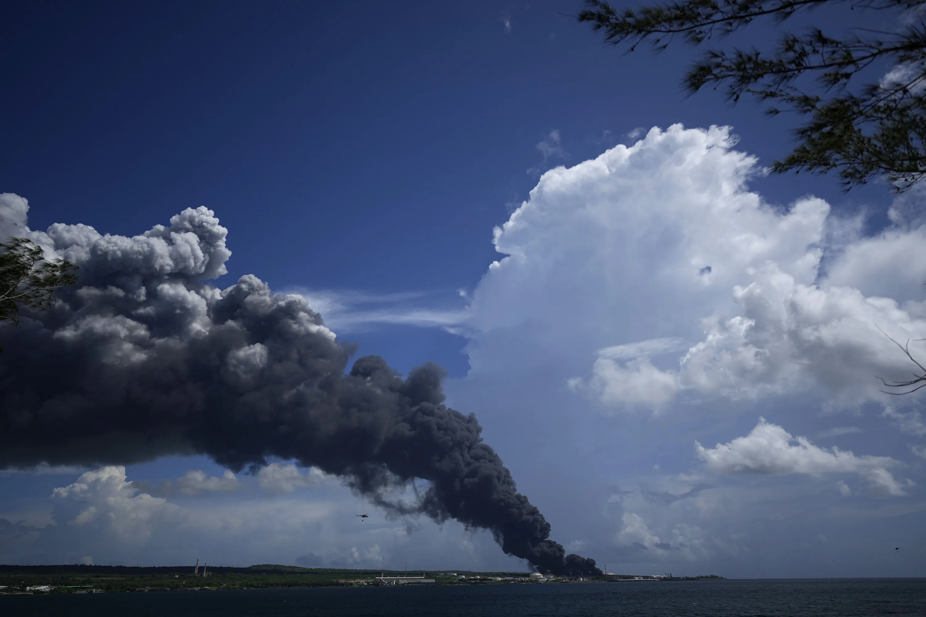 A huge plume of smoke rises from the Matanzas Supertanker Base, as firefighters work to quell a blaze which began during a thunderstorm the night before, in Matazanas, Cuba, Saturday, August 6, 2022. Cuban authorities say lightning struck a crude oil storage tank at the base, causing a fire that led to four explosions which injured more than 50 people. (Photo by Ramon Espinosa/AP Photo)