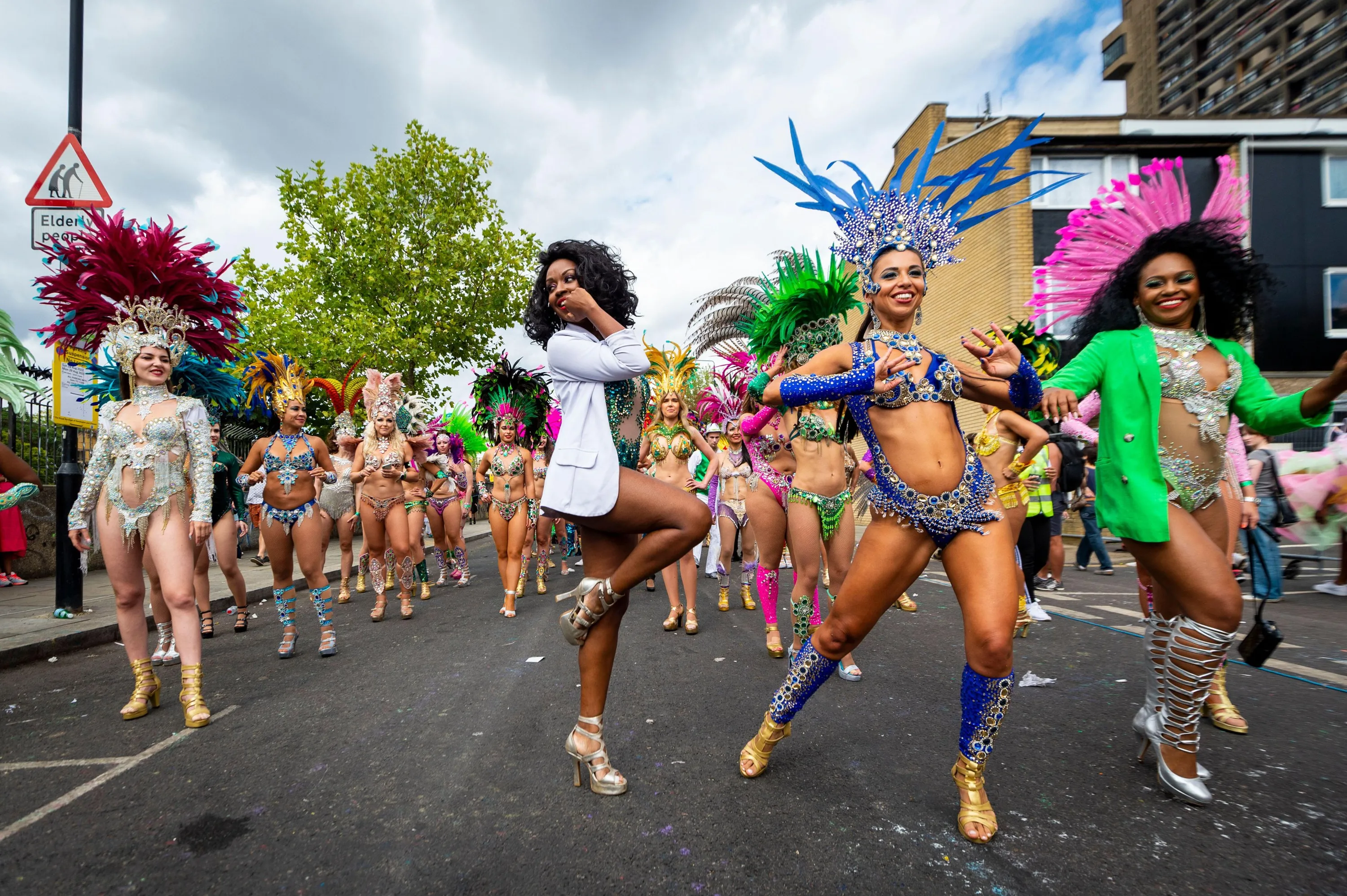 Members of the London School of Samba at the start of the Grand Finale of Notting Hill Carnival in London on August 29, 2022 which has returned to the capital for the first time in three years after being cancelled due to the Covid-19 pandemic. Europe's largest street festival celebrates Caribbean culture and is expected to welcome over 1 million people each day. (Photo by Stephen Chung/Alamy Live News)