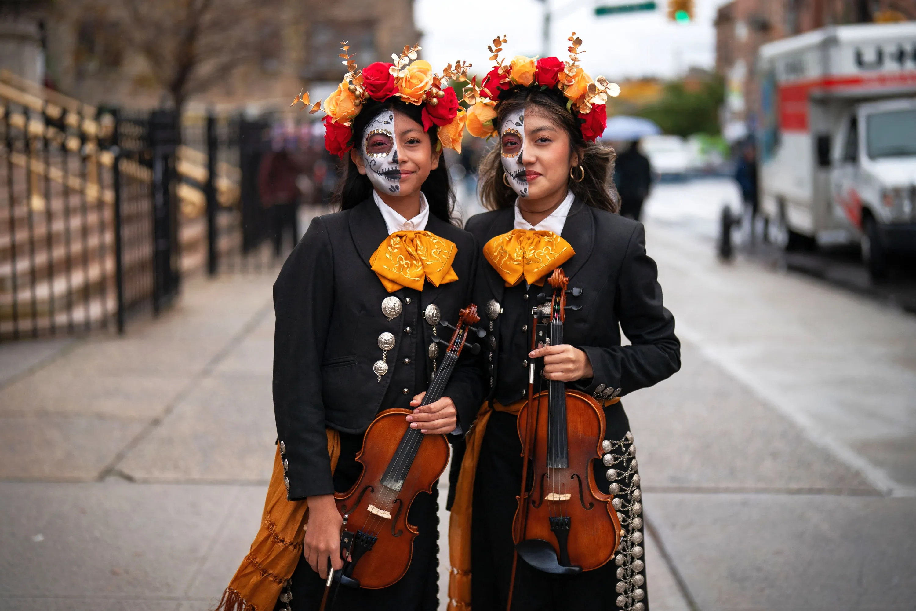 People take part in a Day of the Dead Parade in the Sunset Park neighborhood of Brooklyn in New York on October 29, 2023. (Photo by Adam Gray/AFP Photo)