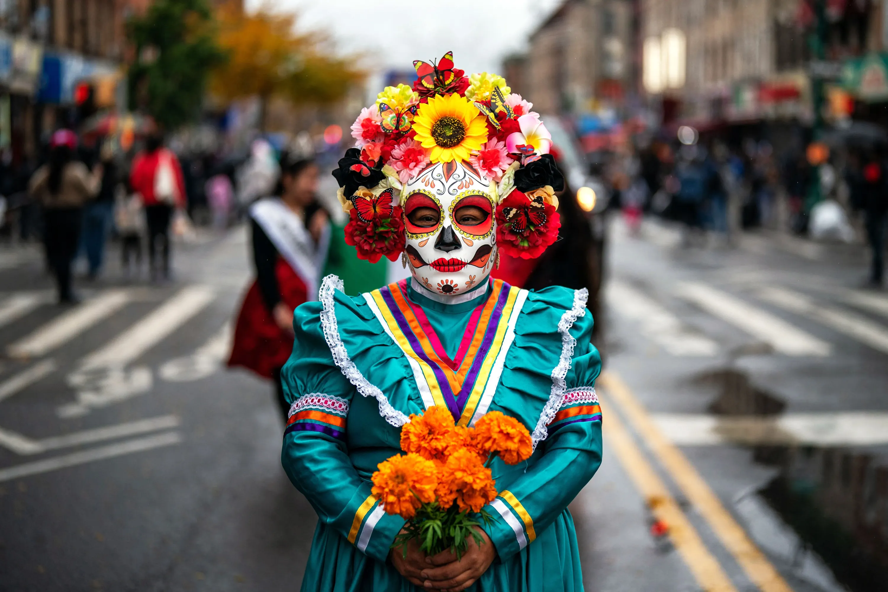 People take part in a Day of the Dead Parade in the Sunset Park neighborhood of Brooklyn in New York on October 29, 2023. (Photo by Adam Gray/AFP Photo)