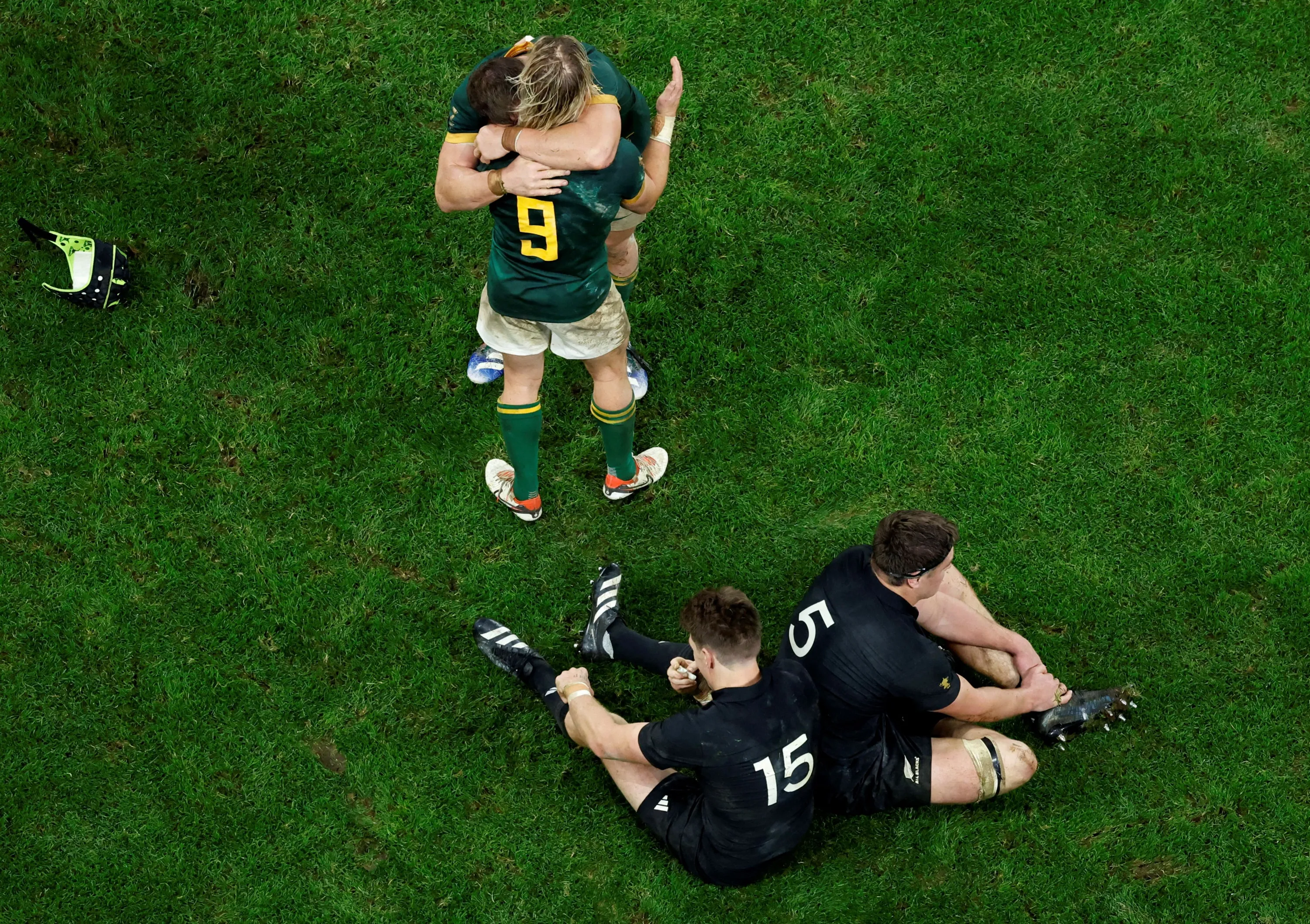 South Africa's Faf de Klerk celebrates after winning the Rugby World Cup final as New Zealand's Beauden Barrett and Scott Barrett look dejected, at the Stade de France in Saint Denis, France on October 28, 2023. (Photo by Peter Cziborra/Reuters)