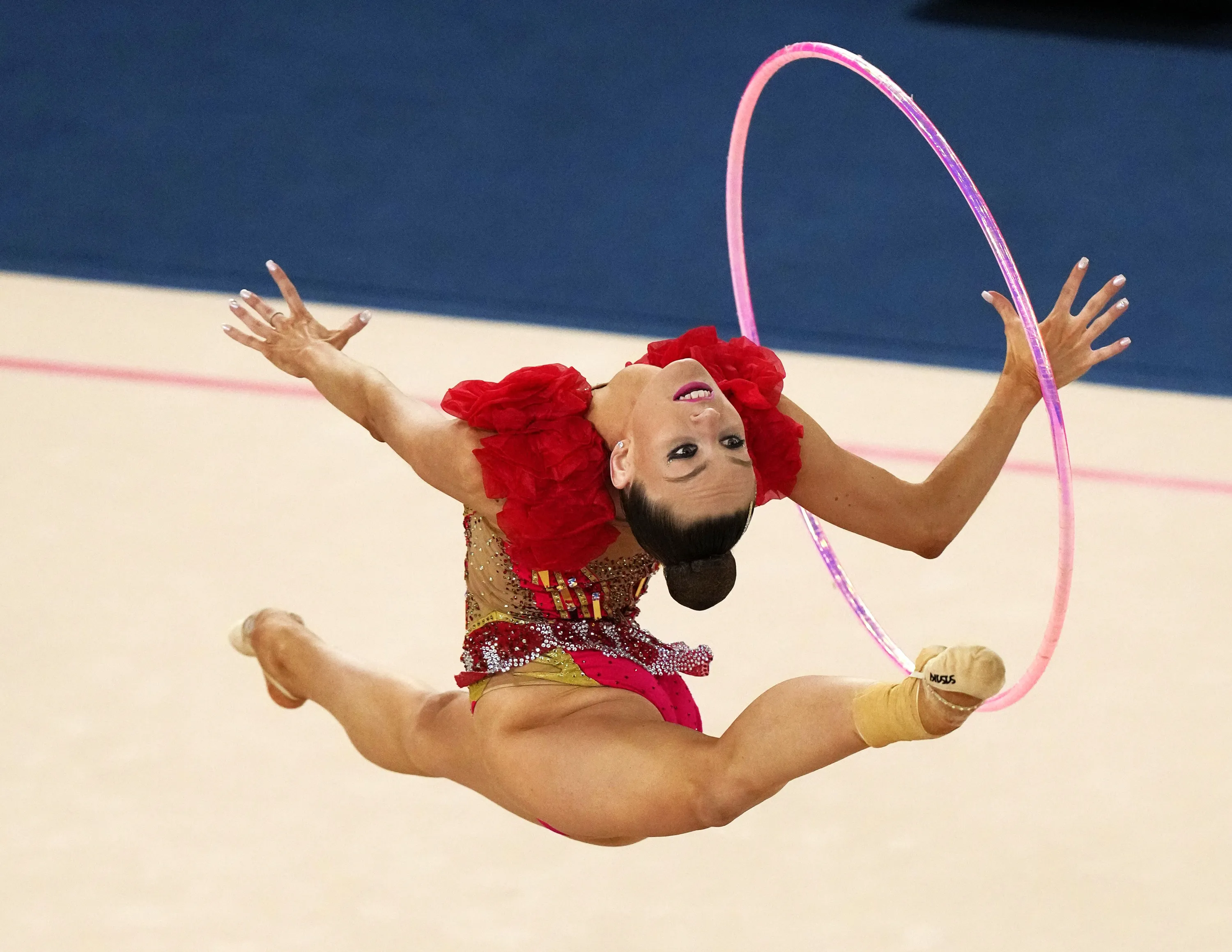 Canada's Carmel Kallemaa competes in rhythmic gymnastics individual all around at the Pan American Games in Santiago, Chile, Wednesday, November 1, 2023. (Photo by Esteban Felix/AP Photo)