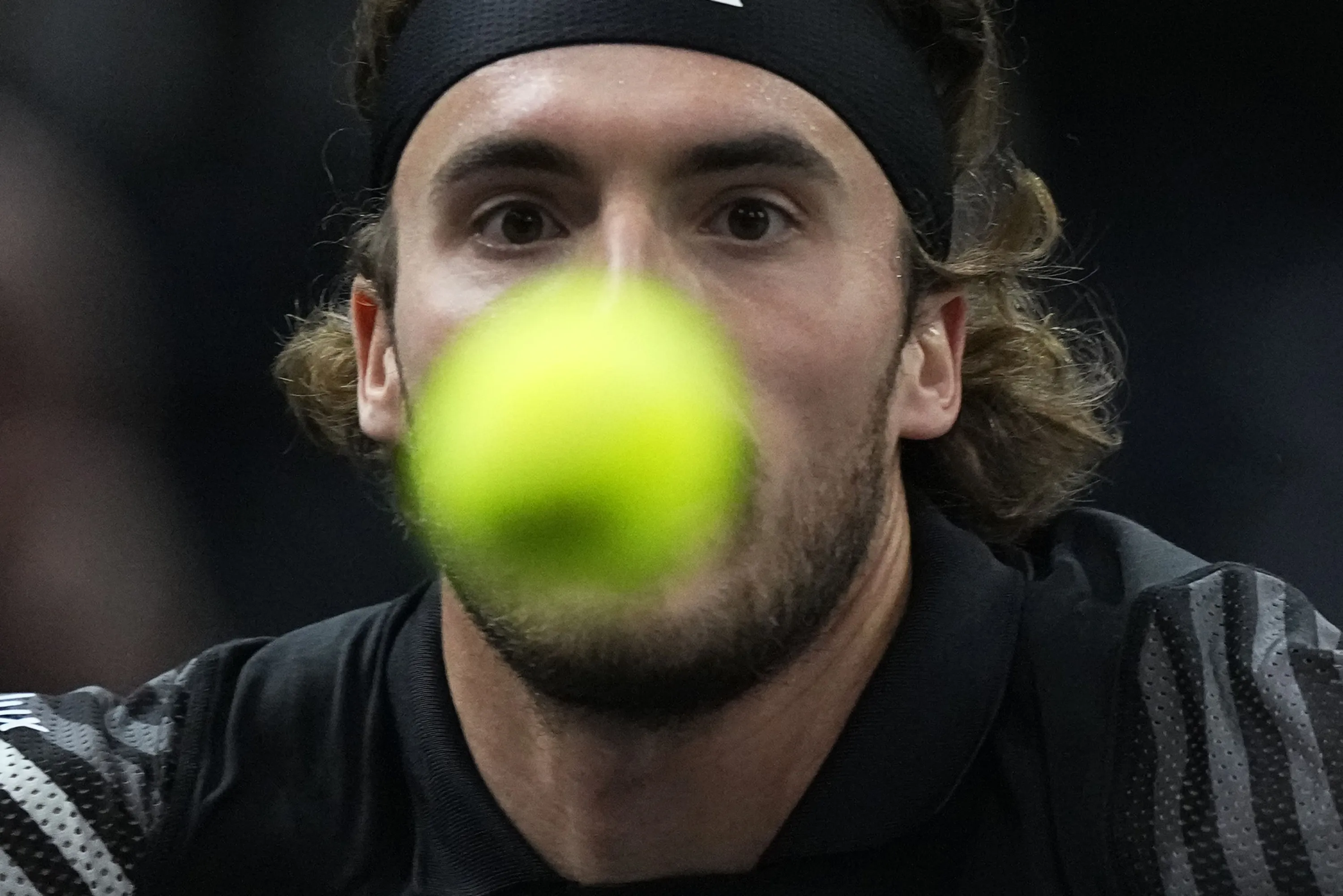 Greece's Stefanos Tsitsipas eyes the ball as he plays Germany's Alexander Zverev during their third round match of the Paris Masters tennis tournament, at the Accor Arena, Thursday November 2, 2023 in Paris. (Photo by Michel Euler/AP Photo)
