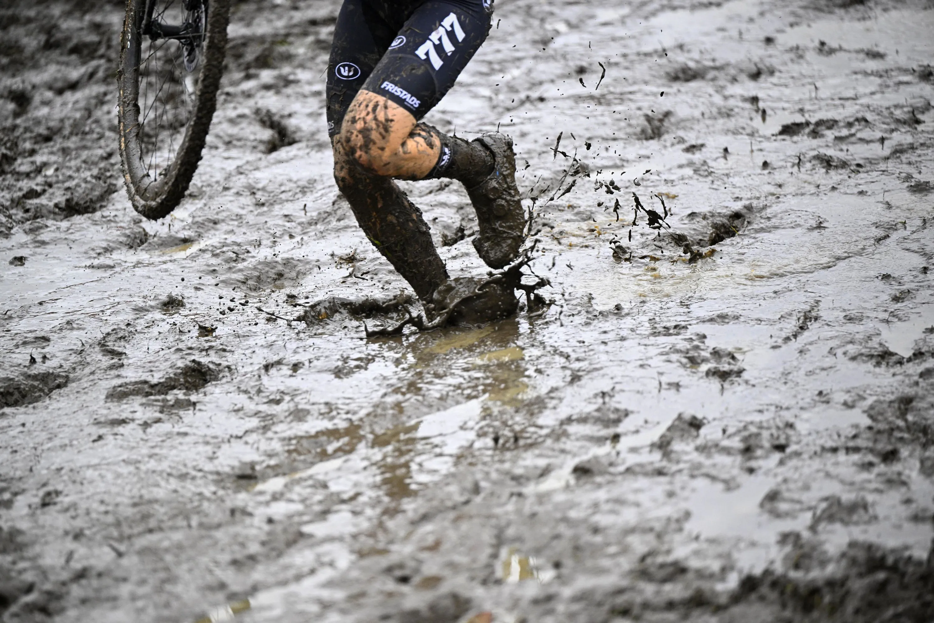 A competitor walks in the mud carrying her bike during the women elite race of the Koppenbergcross, the first race (out of eight) of the X2O Badkamers trophy cyclocross competition, in Melden, Oudenaarde, on November 1, 2023. (Photo by Jasper Jacobs/Belga via AFP Photo)