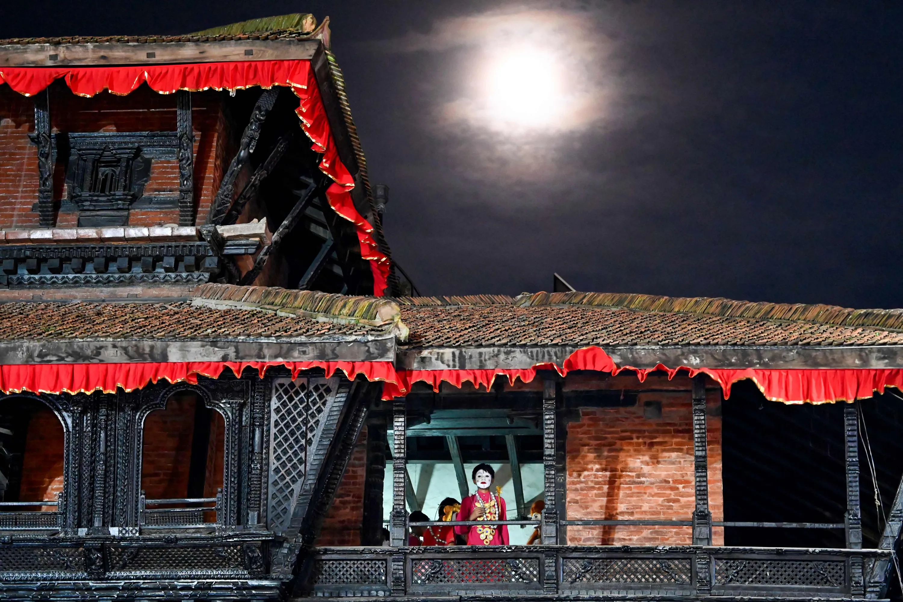 A young Hindu devotee with face paint waits to perform in a play during 'Indra Jatra' festival at the Durbar Square in Kathmandu on September 30, 2023. (Photo by Prakash Mathema/AFP Photo)