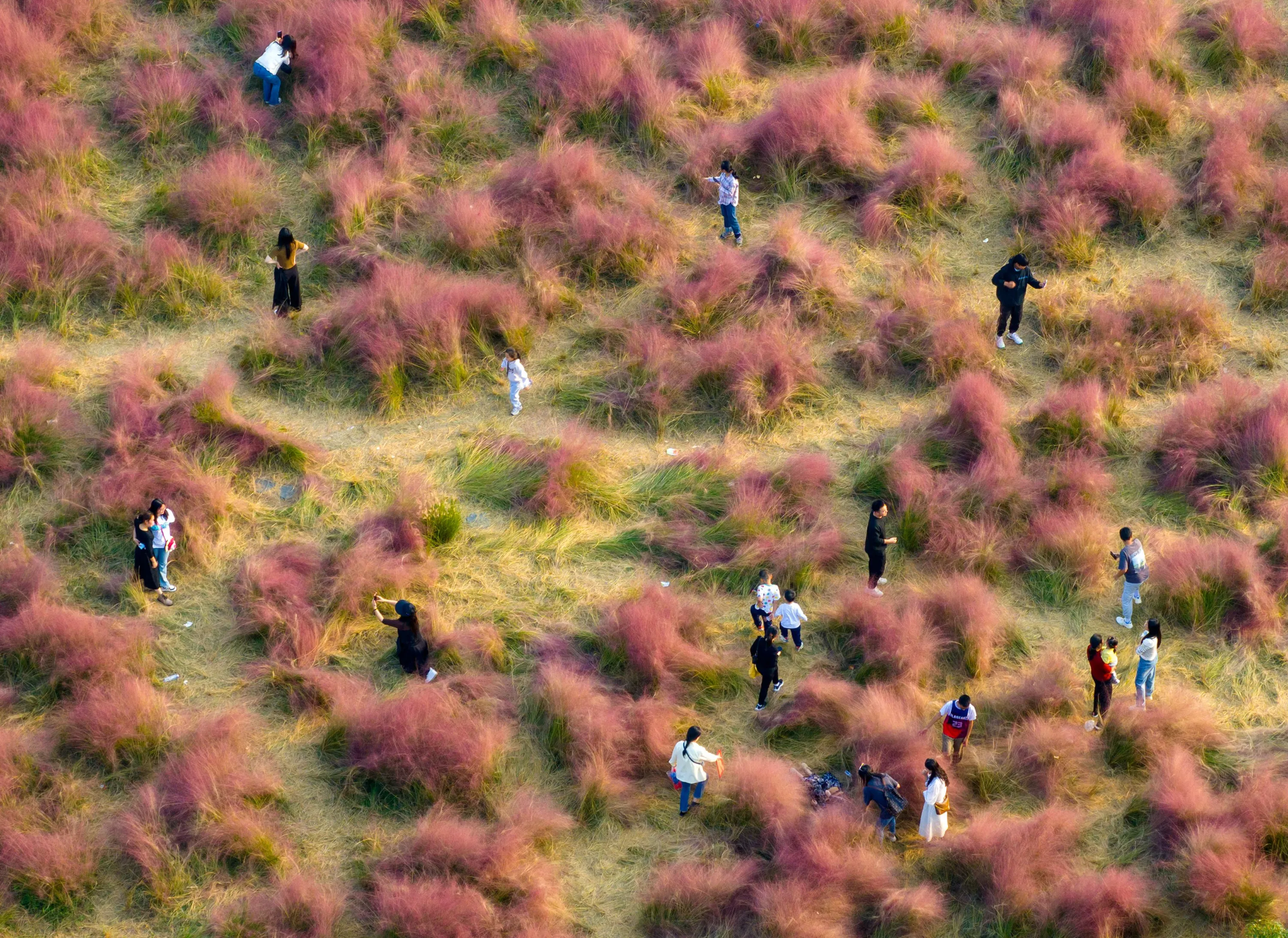 Tourists play in pink grass in the Baima Lake eco-tourism area in Huai'an City, East China's Jiangsu Province on October 15, 2023. (Photo by CFOTO/Future Publishing via Getty Images)