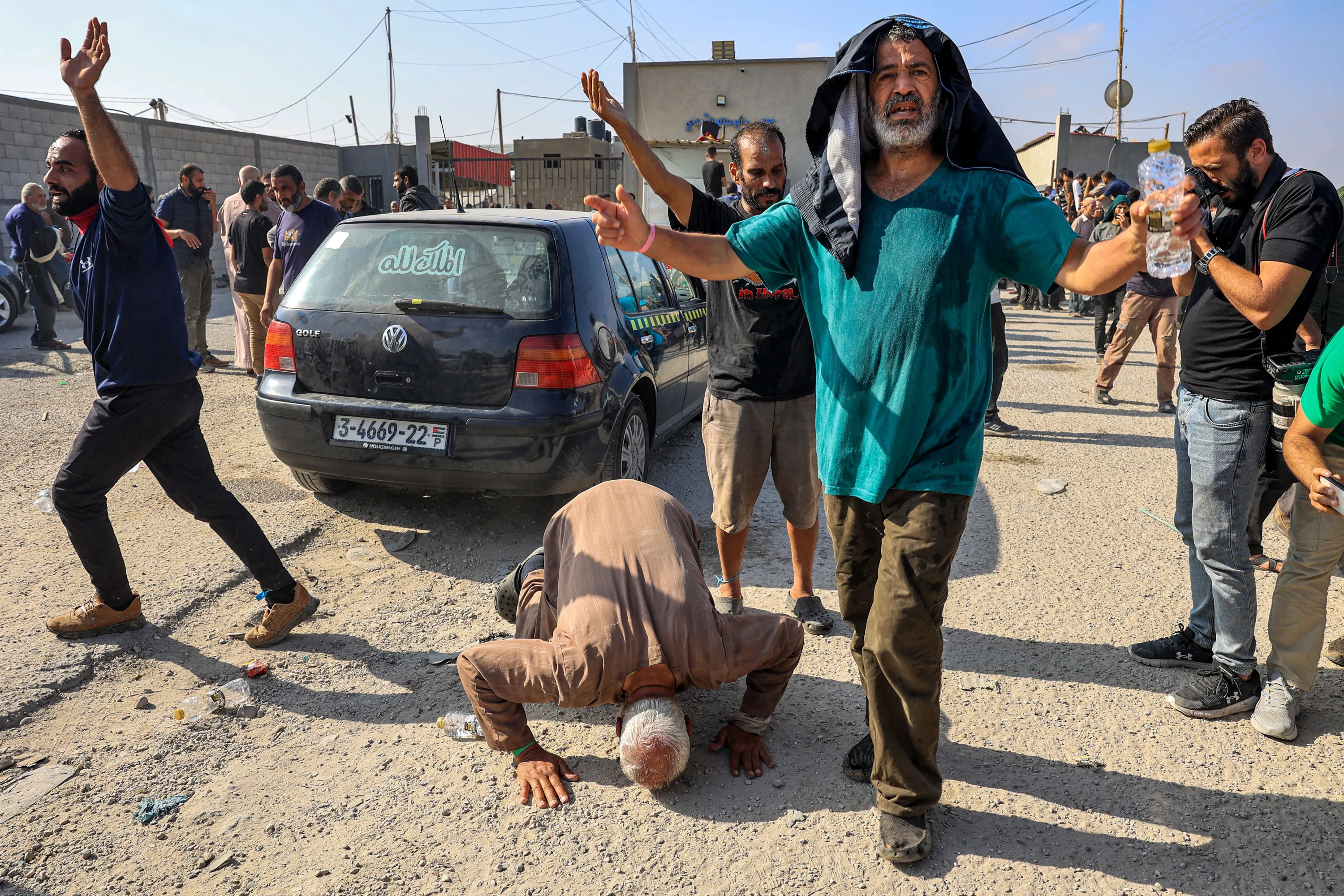 Palestinian workers, who were stranded in Israel since the October 7 attacks, react after crossing back into the Gaza Strip at the Kerem Shalom commercial border crossing with Israel in the south of the Palestinian enclave on November 3, 2023. (Photo by Said Khatib/AFP Photo)
