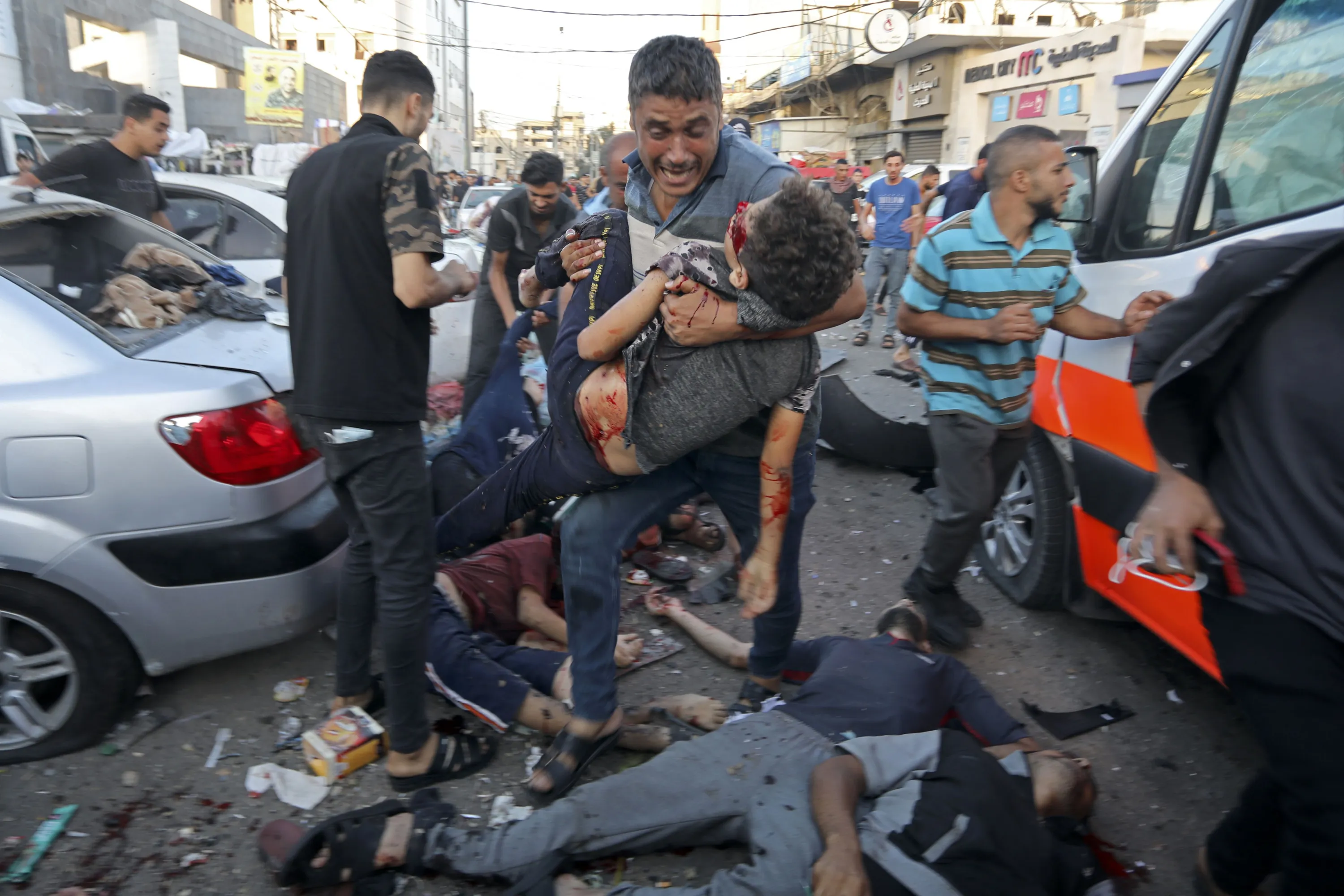 A man steps over the bodies of dead and injured Palestinians lying on the ground following an Israeli airstrike outside the entrance of the al-Shifa hospital in Gaza City, Friday, November 3, 2023. (Photo by Abed Khaled/AP Photo)
