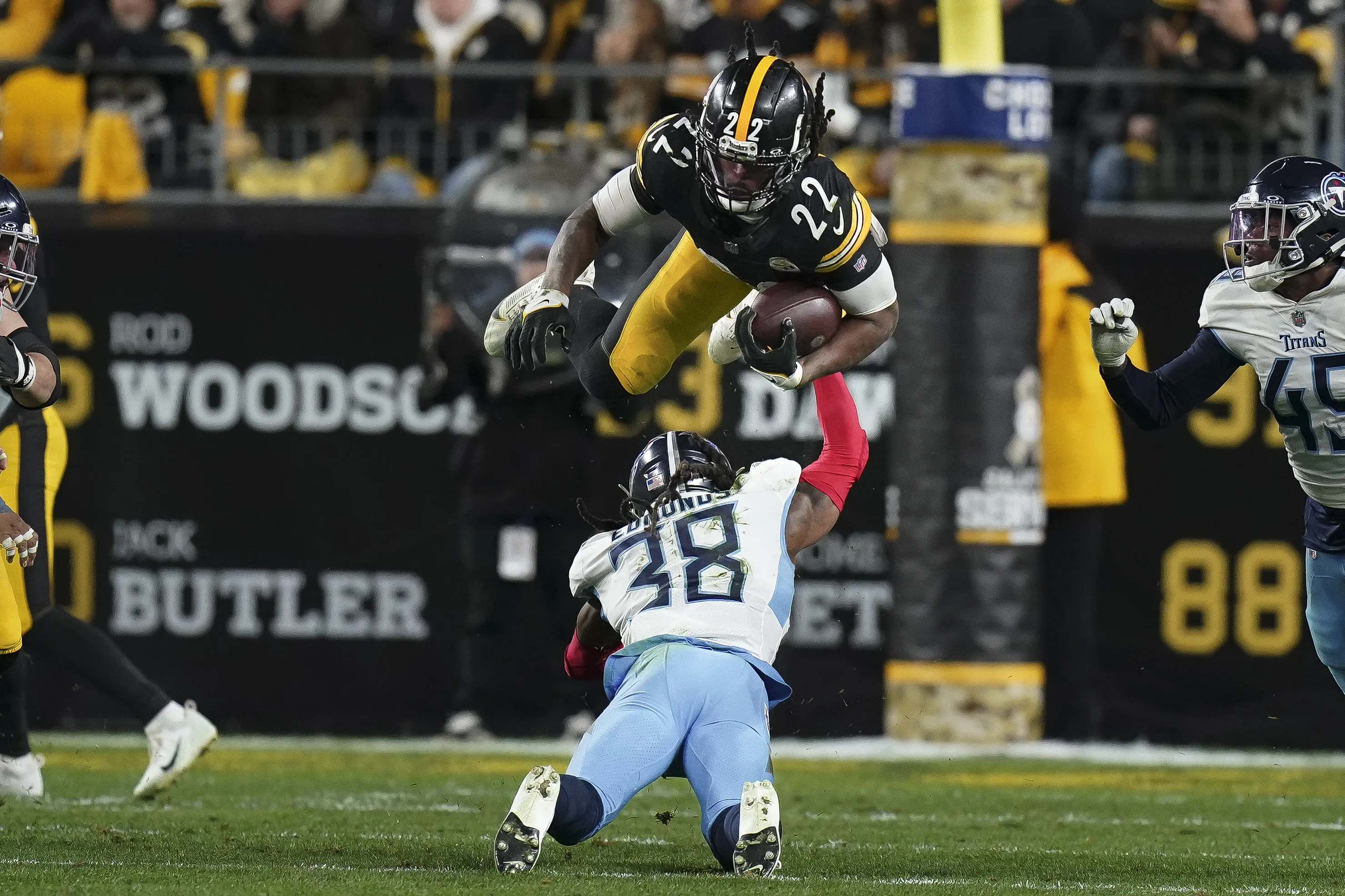 Pittsburgh Steelers running back Najee Harris (22) leaps over Tennessee Titans safety Terrell Edmunds (38) during the second half of an NFL football game Thursday, November 2, 2023, in Pittsburgh. (Photo by Matt Freed/AP Photo)