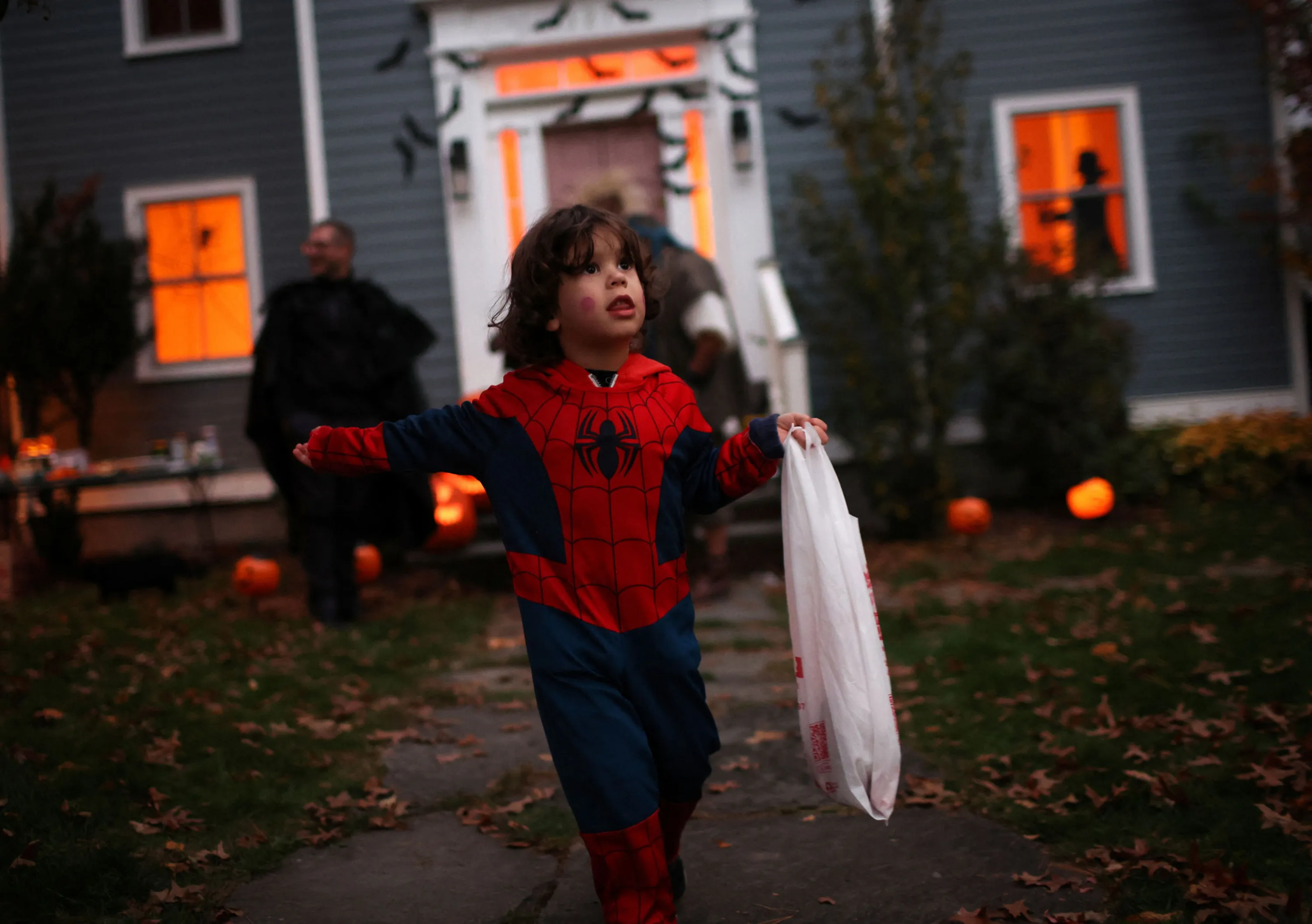 A child in Halloween costume goes trick or treating in the New York City suburb of Upper Nyack, New York, U.S., October 31, 2023. (Photo by Mike Segar/Reuters)