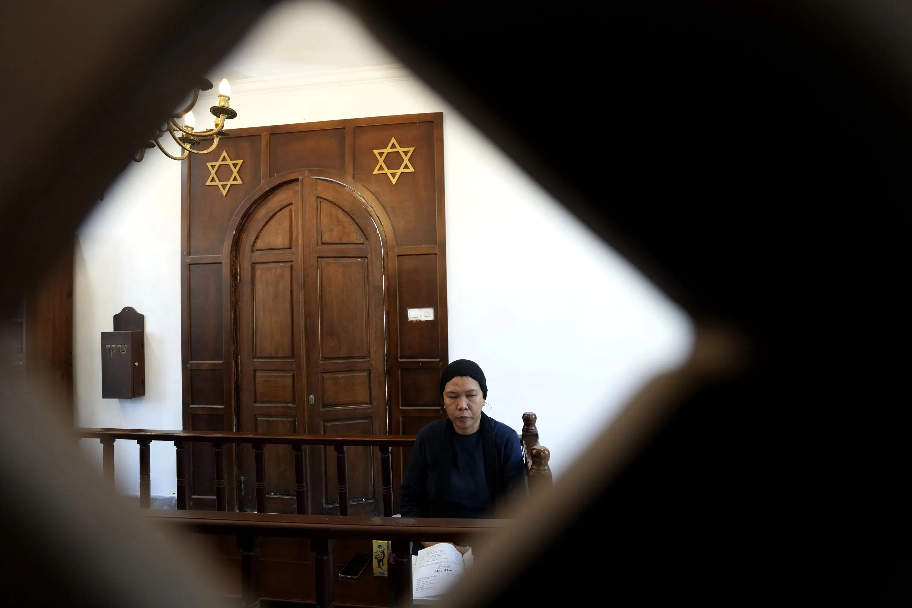 A woman prays at Shaar Hashamayim Synagogue in Tondano, North Sulawesi, Indonesia, Saturday, October 14, 2023. An Indonesian rabbi at the only synagogue in the world's most populous Muslim-majority nation, called on Saturday for peace and an an end to the fightings in Israel and Gaza. (Photo by Tatan Syuflana/AP Photo)
