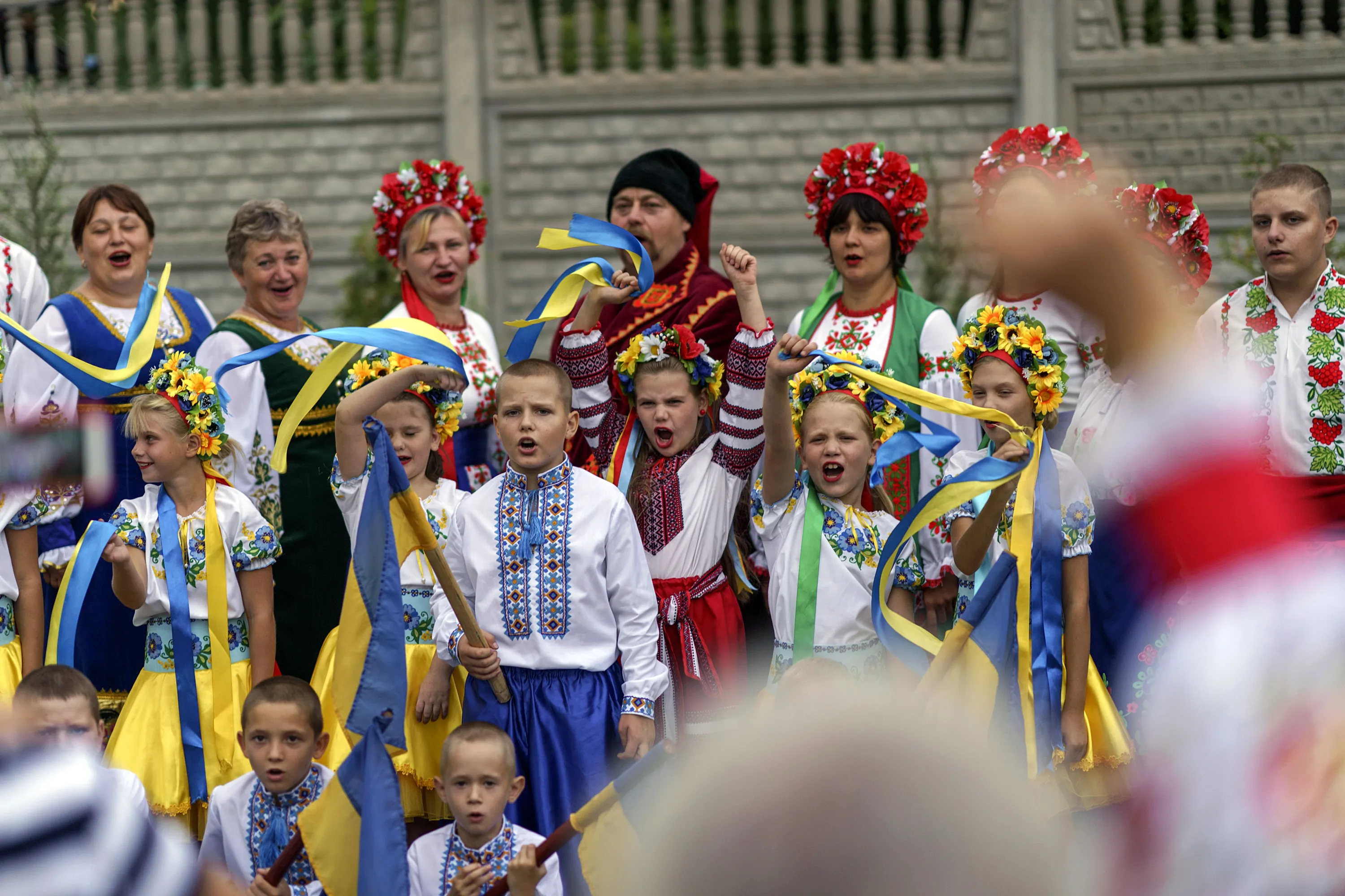 Members of a local community center wear traditional Ukrainian clothing to record an online video message for the country's upcoming Independence Day on Aug. 24 in Andriivka, Donetsk region, eastern Ukraine, Friday, August 19, 2022. (Photo by David Goldman/AP Photo)