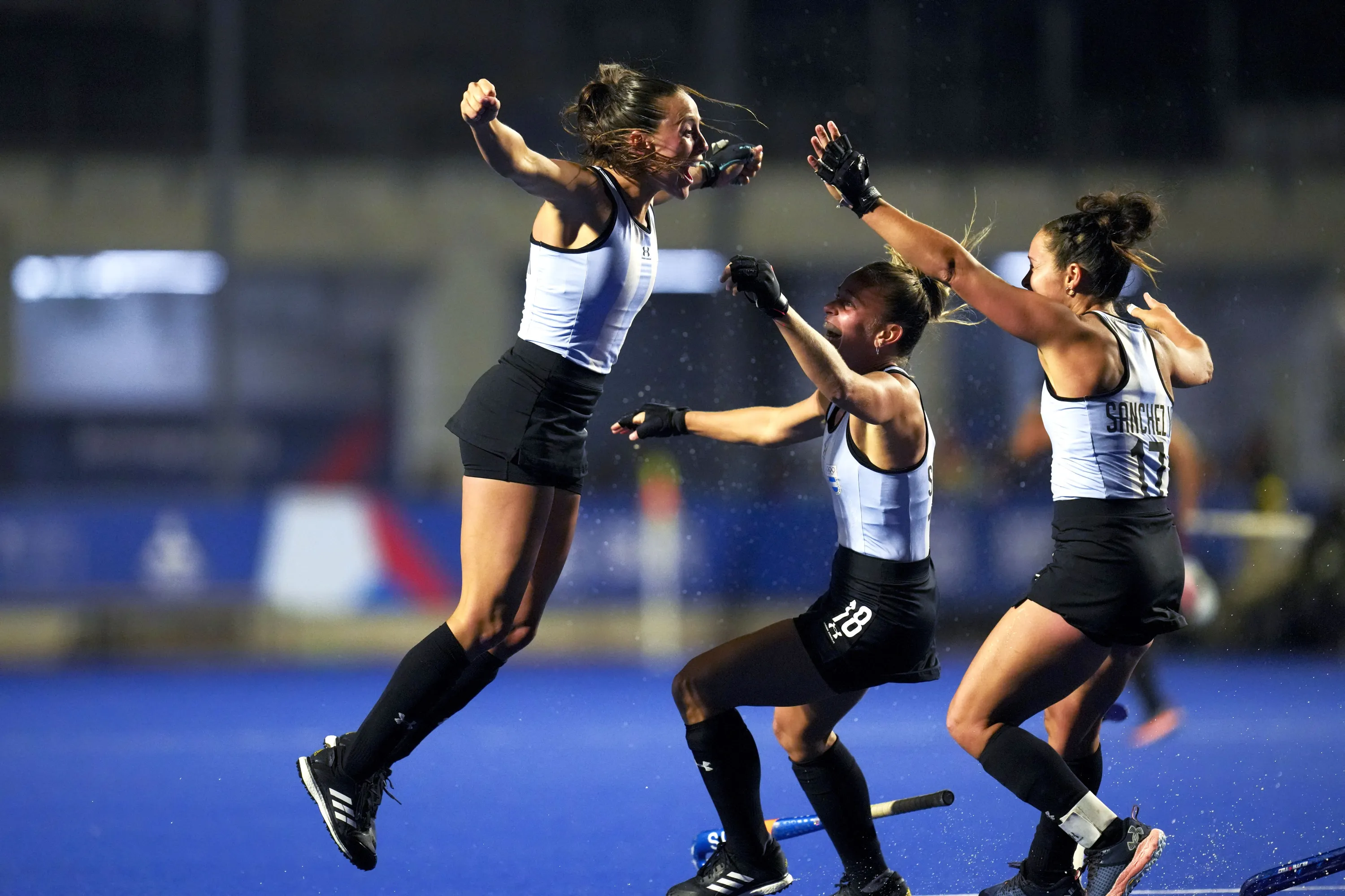 Argentina's Eugenia Trinchinetti, left, celebrates scoring against the United States, with teammates Rocio Sanchez, right, and Victoria Sauze, during the women's field hockey gold medal match, at the Pan American Games in Santiago, Chile, Saturday, November 4, 2023. (Photo by Dolores Ochoa/AP Photo)