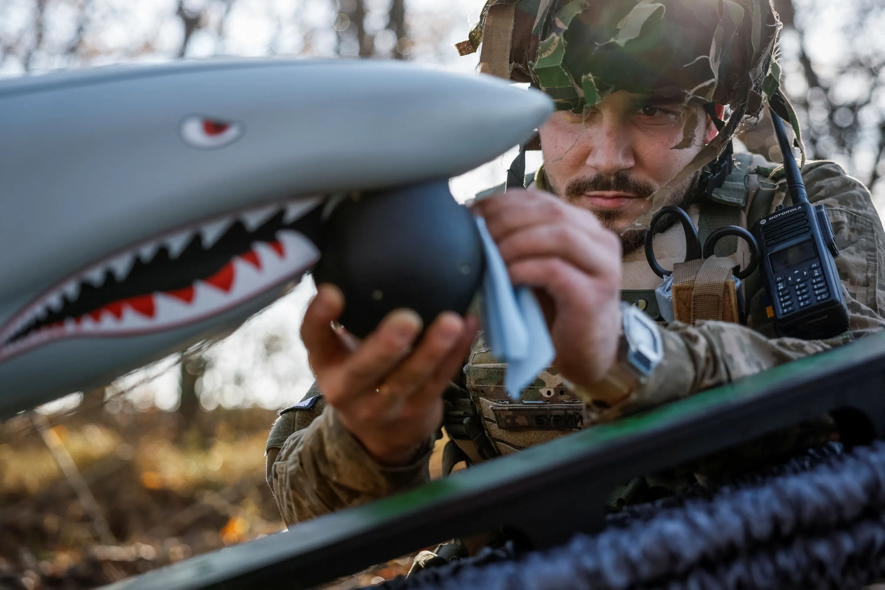 Serviceman of the 15th Separate Artillery Reconnaissance Brigade of the Armed Forces of Ukraine, callsign Buryi, 30-years-old, cleans a camera of a Shark drone before launching, amid Russia's attack on Ukraine, in Kharkiv region, Ukraine on October 30, 2023. (Photo by Alina Smutko/Reuters)