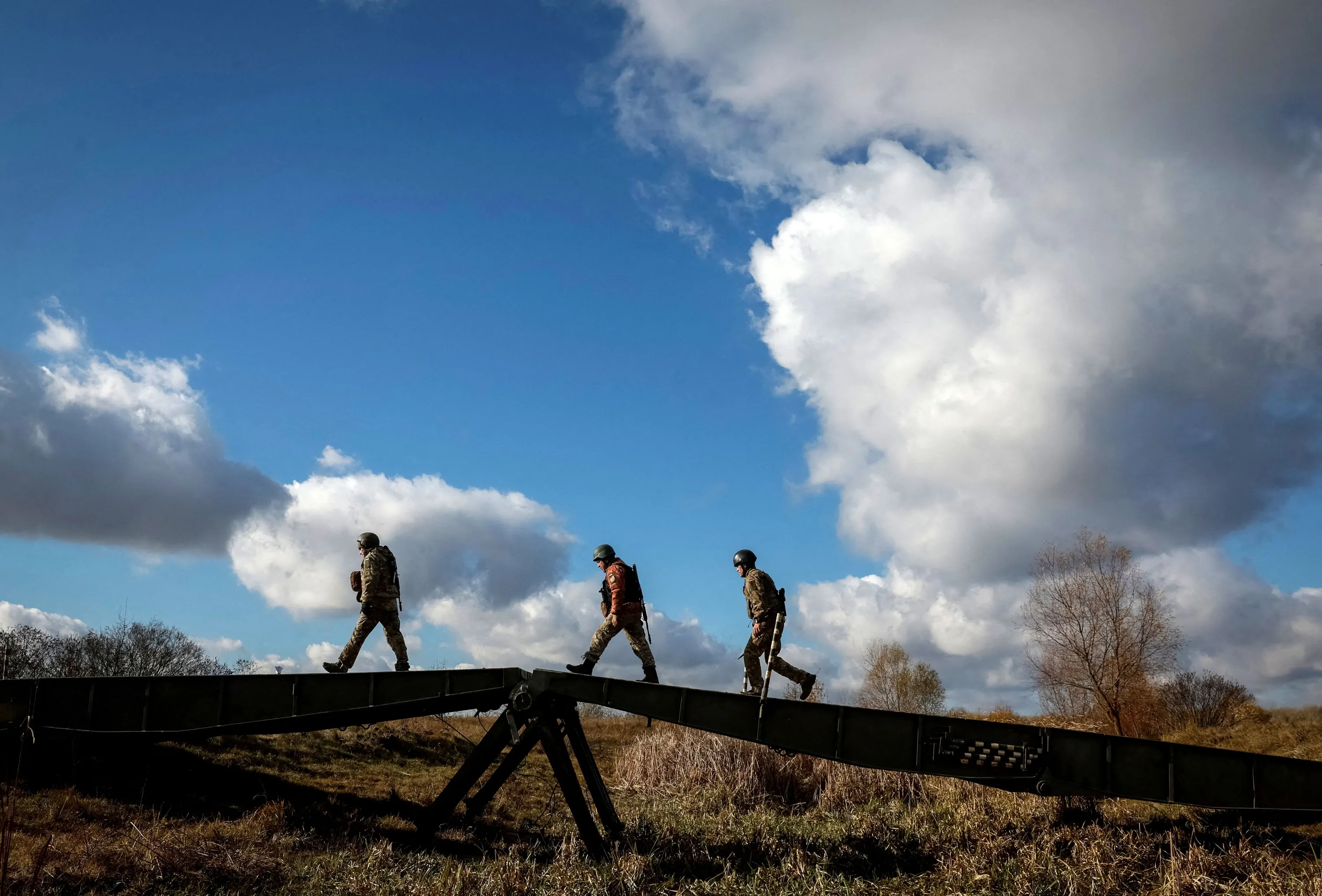 Ukrainian servicemen build a bridge during an exercise, amid Russia's attack on Ukraine, in Chernihiv region, Ukraine on November 2, 2023. (Photo by Gleb Garanich/Reuters)
