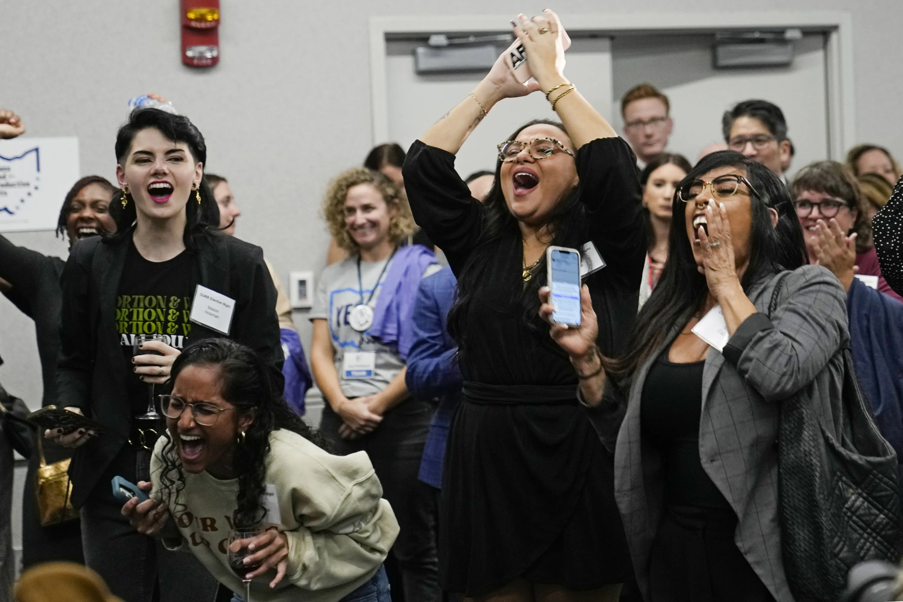 Issue 1 supporters celebrate at a watch party, Tuesday, November 7, 2023, in Columbus Ohio. Ohio voters have approved a constitutional amendment that guarantees the right to abortion and other forms of reproductive health care. The outcome of Tuesday’s intense, off-year election was the latest blow for abortion opponents. (Photo by Sue Ogrocki/AP Photo)