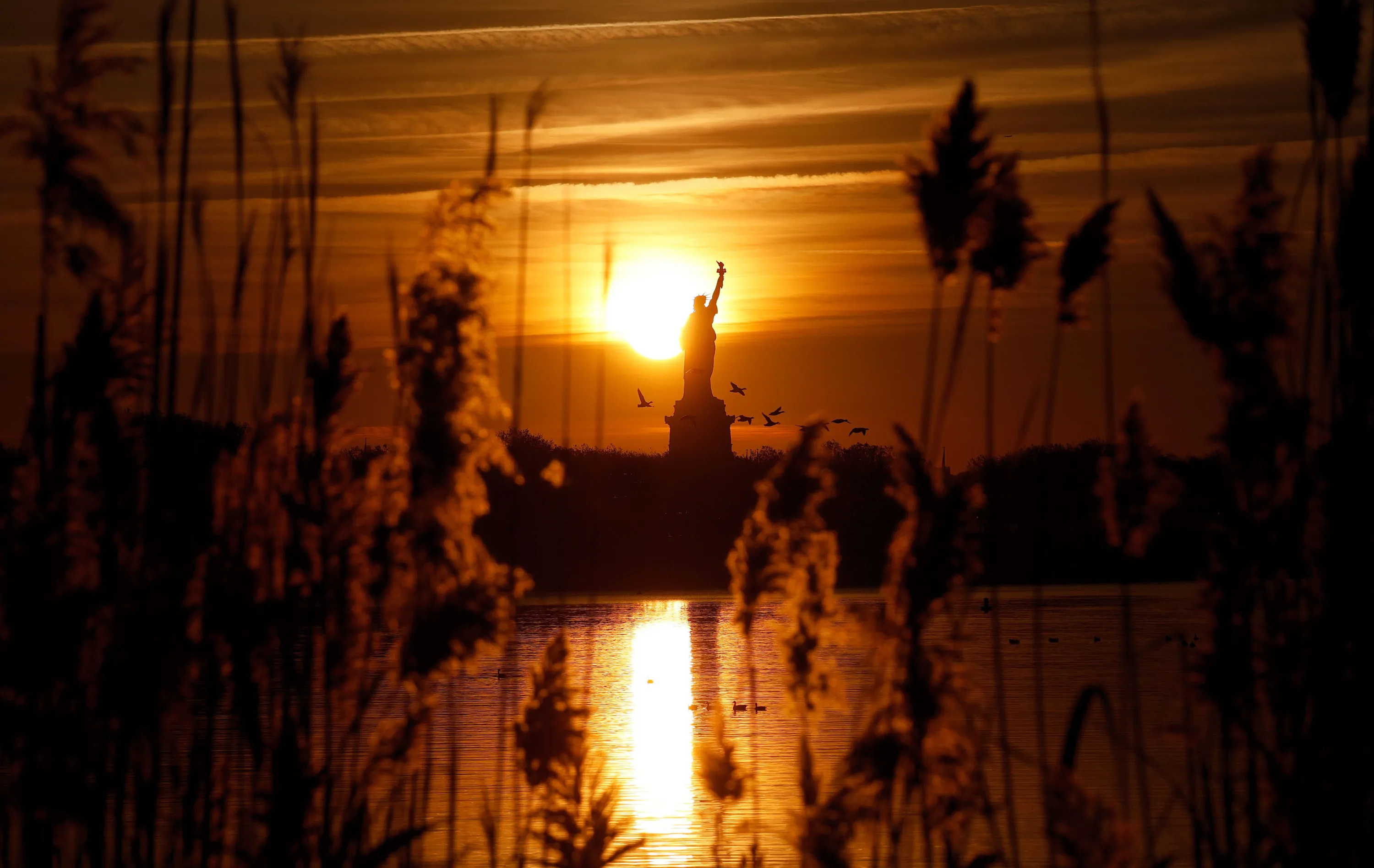 The sun rises behind the Statue of Liberty in New York City on November 4, 2023, as seen from Jersey City, New Jersey. (Photo by Gary Hershorn/Getty Images)