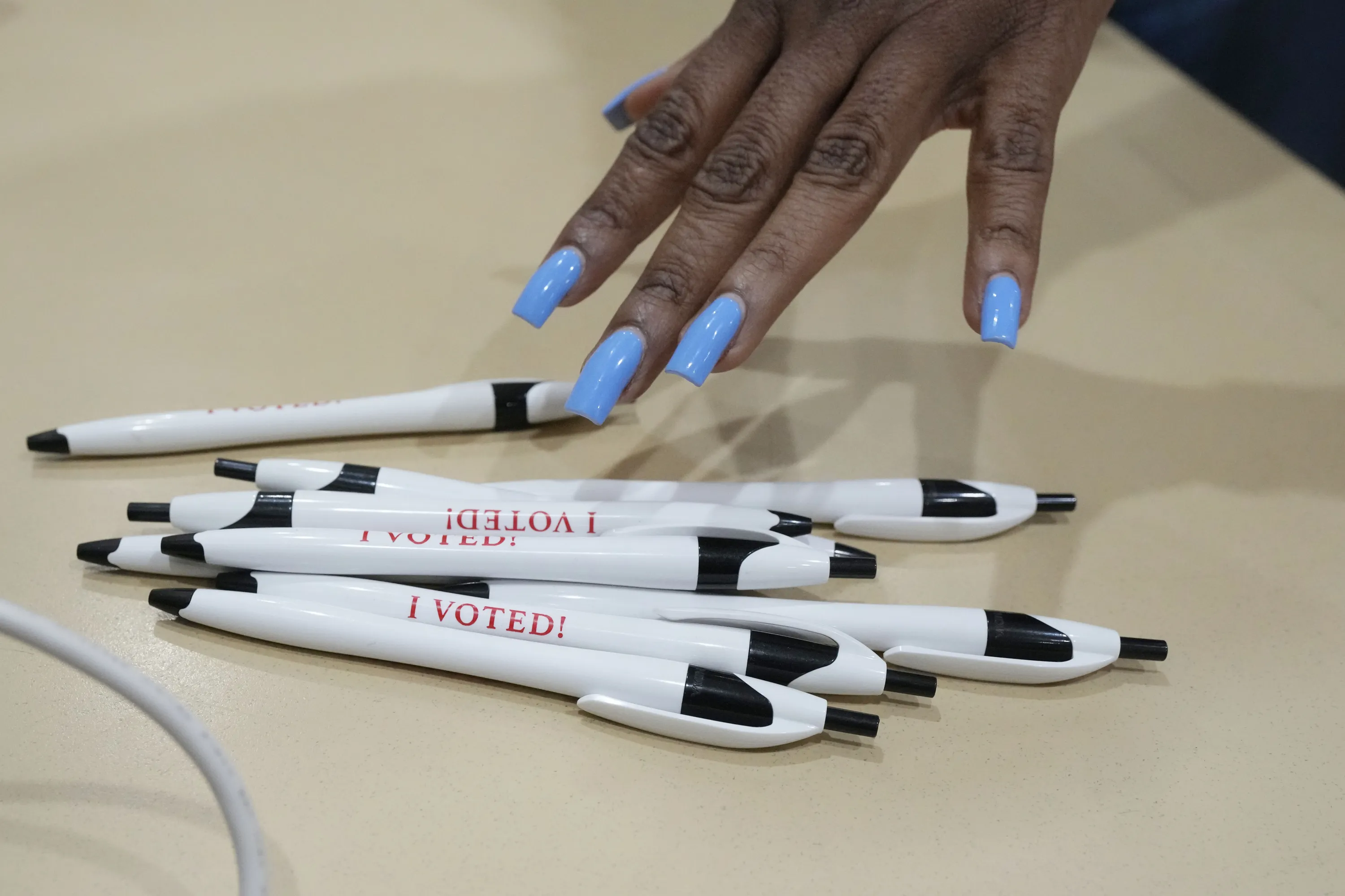 A voter reaches for a “I Voted!” pen to mark her ballot at this north Jackson, Miss., precinct, Tuesday, November 7, 2023. Statewide offices as well as a number of local and county offices are on the ballot. (Photo by Rogelio V. Solis/AP Photo)