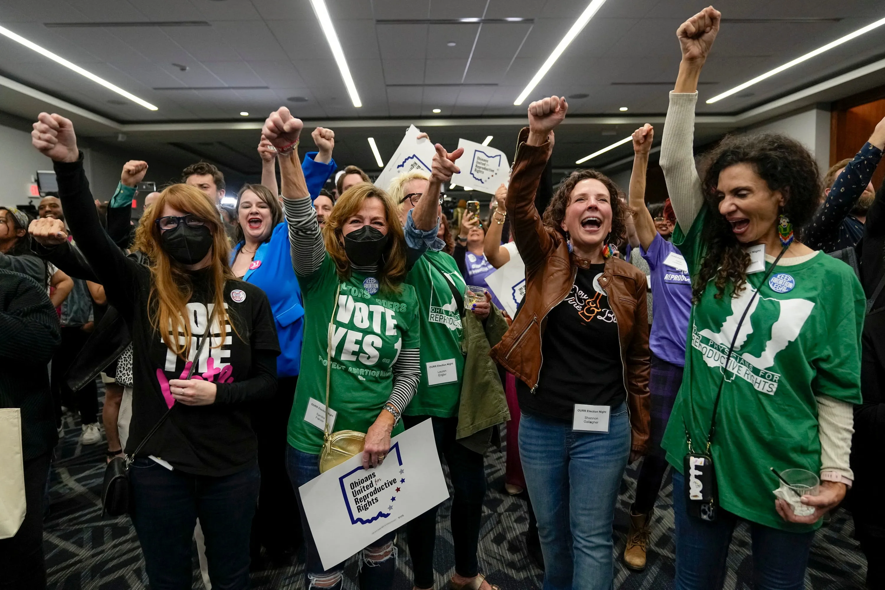 Supporters cheer following the announcement of the projected passage of Issue 1, a state constitutional right to abortion, during a gathering at the Hyatt Regency Downtown in Columbus, Ohio, U.S. November 7, 2023. (Photo by Adam Cairns/USA Today Network via Reuters)