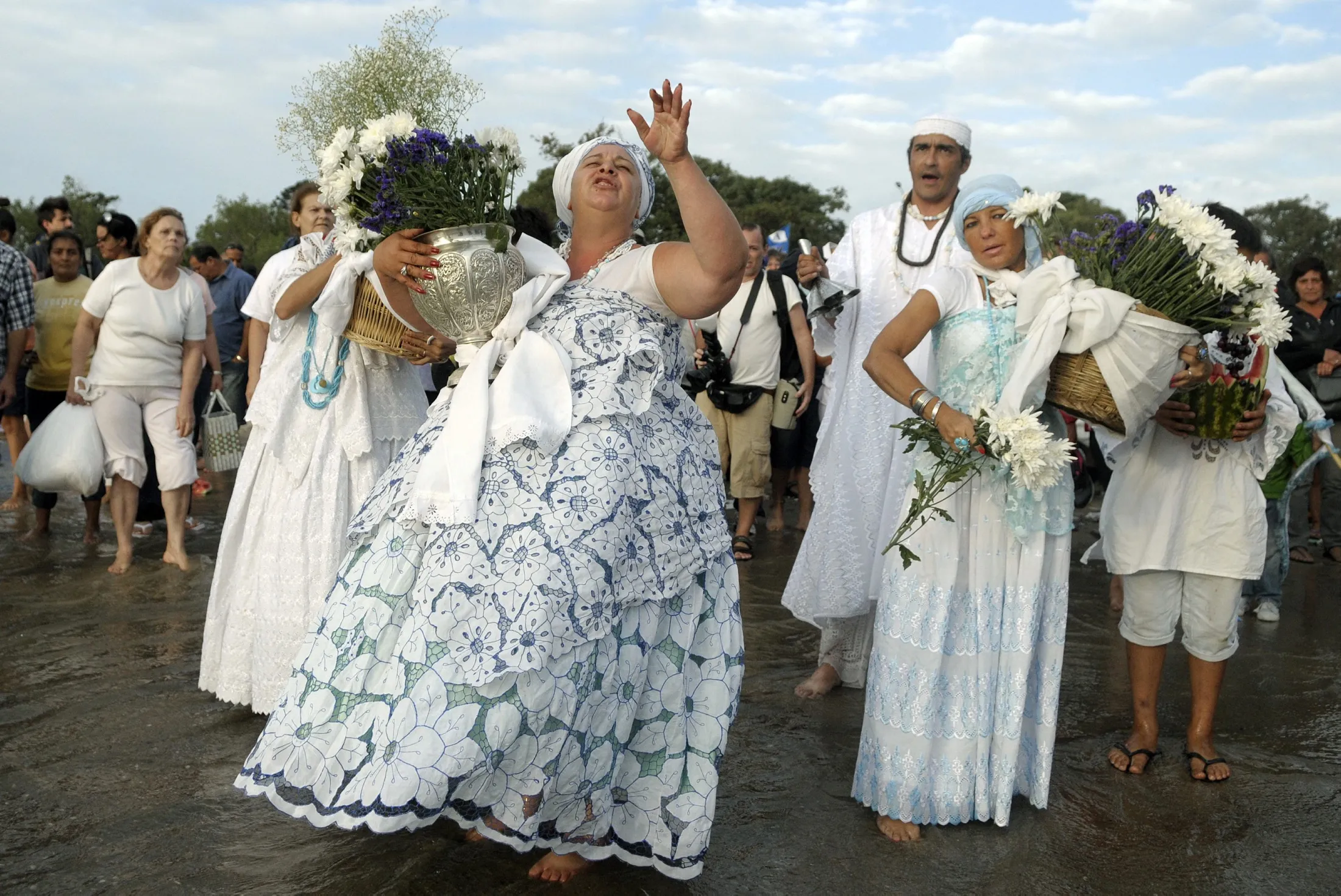 Faithful prepare to wade into the ocean to deliver their offerings to Yemanja, the African sea goddess, during a ceremony honoring the deity in Montevideo, Uruguay, Saturday, Feb. 2, 2013. Thousands of worshippers come to the beach in Montevideo on her feast day, Feb. 2, bearing candles, flowers, perfumes and fruit to show their gratitude for her blessings bestowed upon them. The belief in the goddess sprouts from Umbanda, a blend of religions that include African, Catholicism and Spiritism. (AP Photo/Matilde Campodonico)