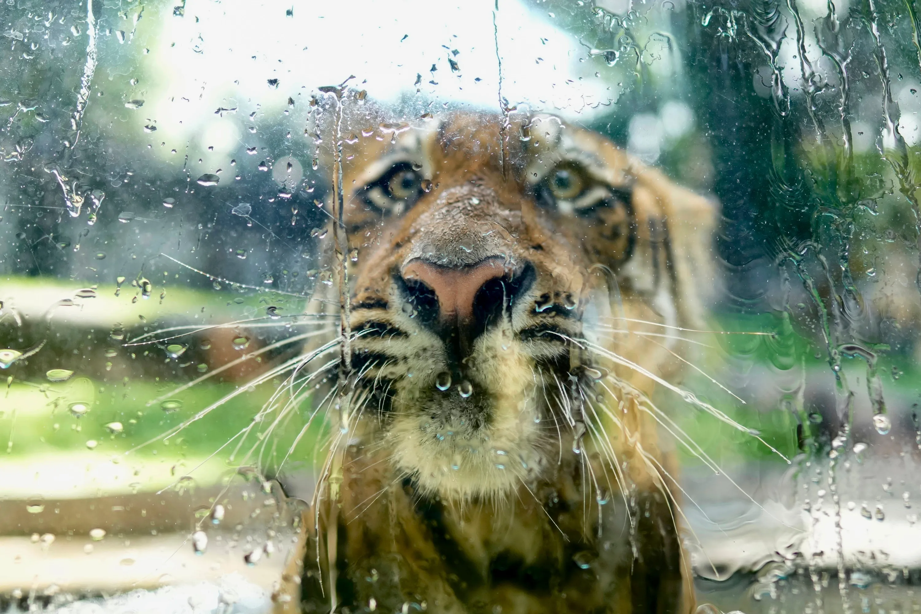 A Bengal Tiger looks through glass as water is sprayed to keep it cool at the national zoological garden in Colombo, Sri Lanka, Tuesday, June. 27, 2023. (Photo by Eranga Jayawardena/AP Photo)