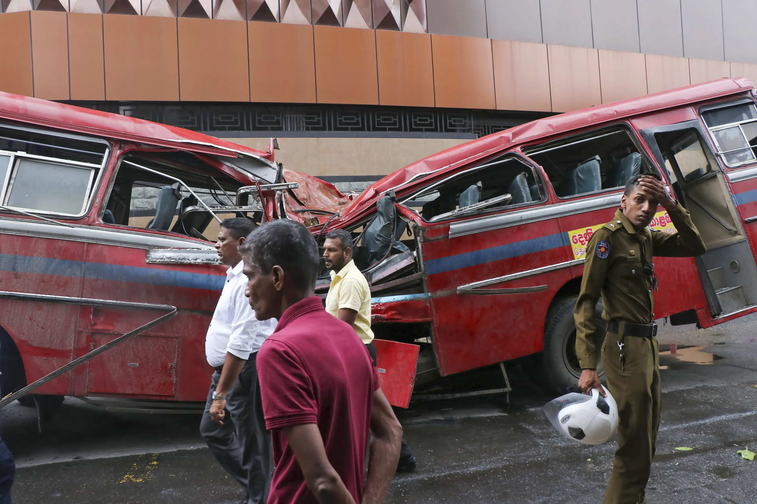 A security officer stands by a bus that was damaged when a tree fell on it in Colombo, Sri Lanka, Friday, October 6, 2023. A large tree fell on the moving bus, killing five people and injuring five others, said Dr. Rukshan Bellana, a spokesperson for the capital’s main hospital. Heavy rain triggered floods and mudslides and downed trees in many parts of Sri Lanka. (Photo by AP Photo/Stringer)