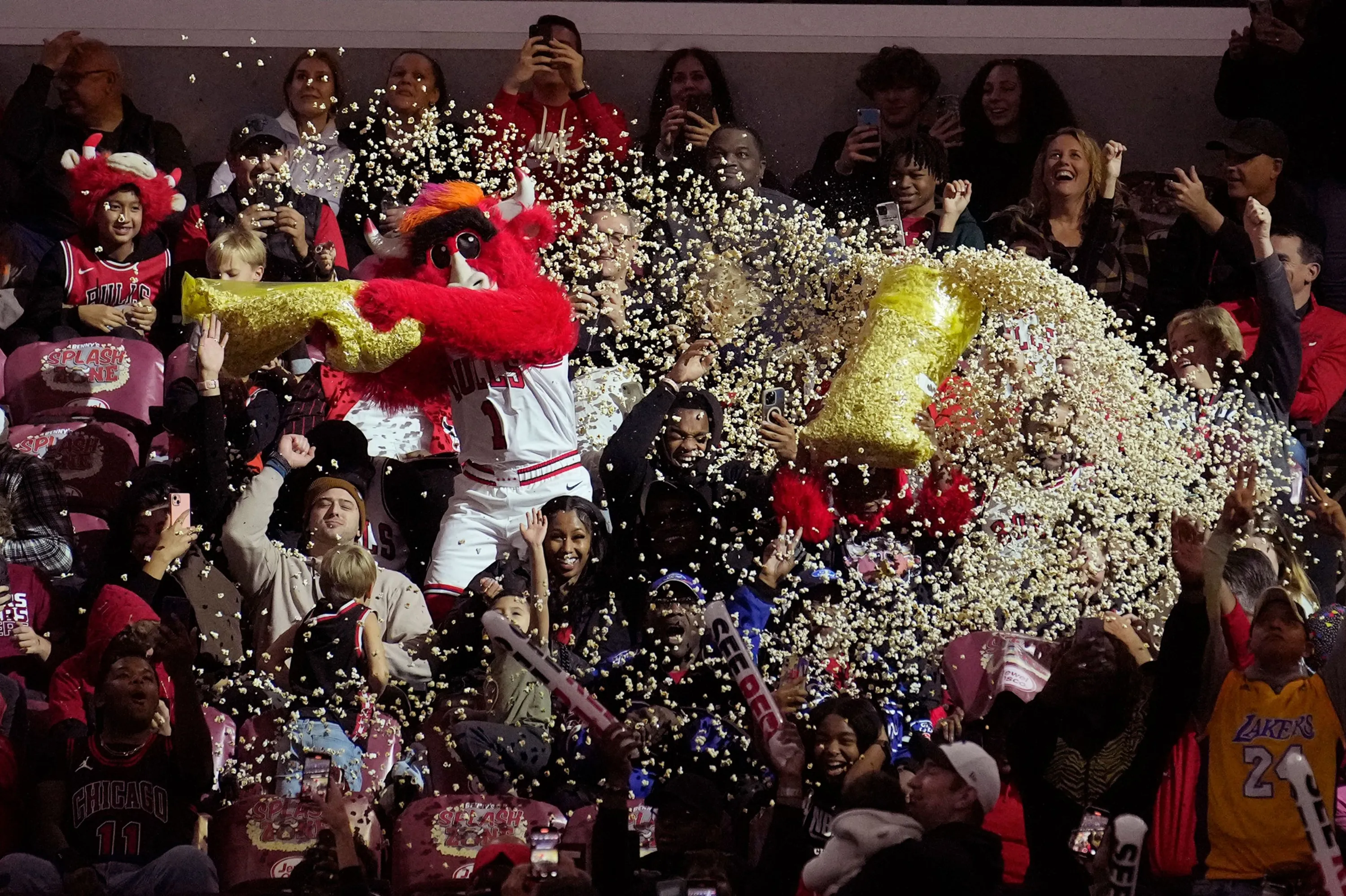 The Chicago Bulls mascot Benny The Bulls pours a complete bag of popcorn on fans during a break in the action in the first half of an NBA basketball game between the Bulls and the Utah Jazz Monday, November 6, 2023, in Chicago. (Photo by Charles Rex Arbogast/AP Photo)