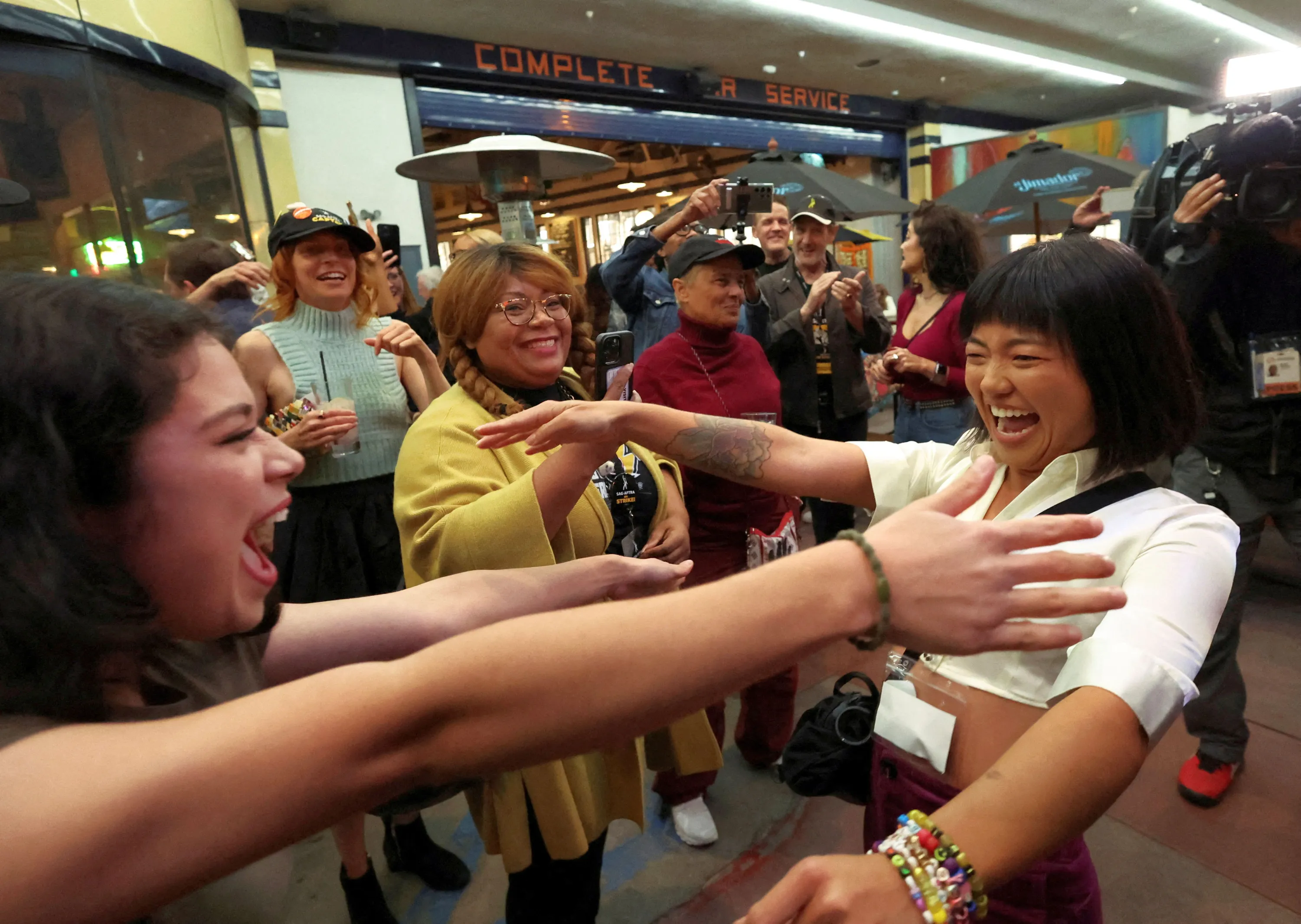 Union team captain Iris Liu reacts after the SAG-AFTRA TV/Theatrical Committee approved a tentative agreement with the Alliance of Motion Picture and Television Producers (AMPTP) to bring an end to the 118-day actors strike, at a brewery in Los Angeles, California on November 9, 2023. (Photo by Mario Anzuoni/Reuters)