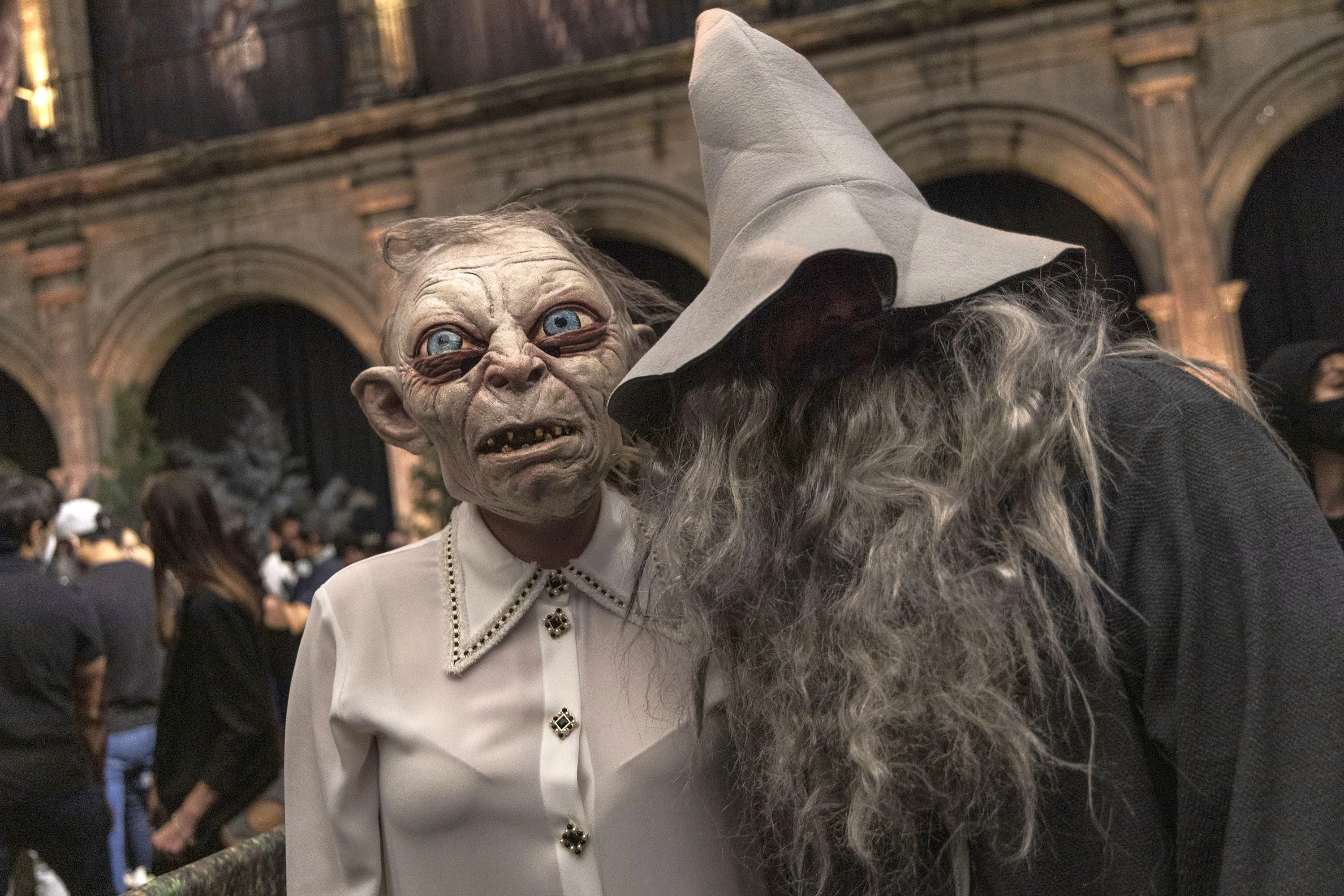 Fans of the Lord of the Rings cosplay as Golum and Gandalf during “The Lord Of The Rings: The Rings Of Power” red carpet at Colegio Vizcainas on August 17, 2022 in Mexico City, Mexico. (Photo by Cristopher Rogel Blanquet/Getty Images)