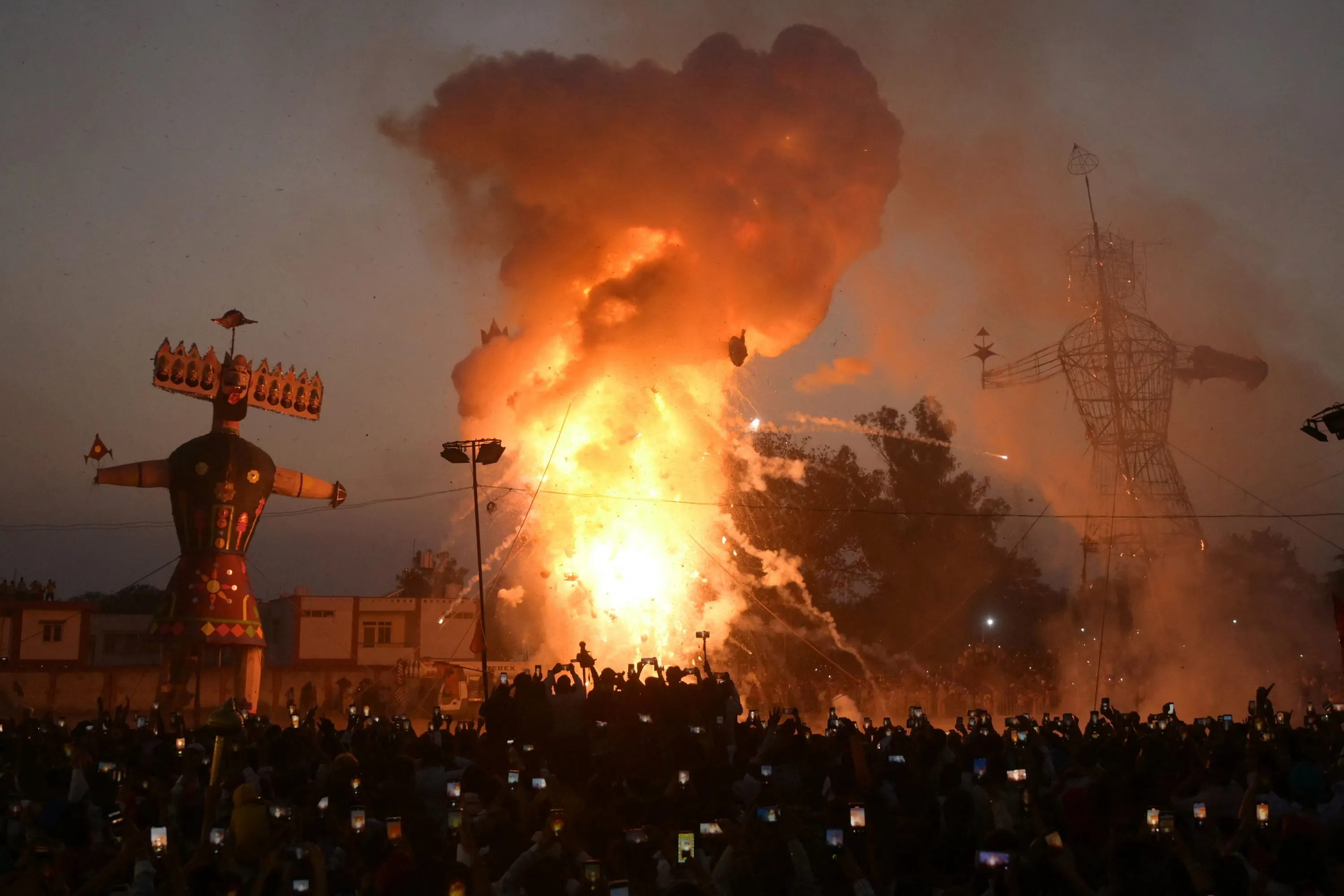 People watch the effigies of Hindu demon Ravana (C), his son Meghnath (L), and brother Kumbhkaran (R) burn on the occasion of the Hindu festival of “Dussehra” in Amritsar on October 24, 2023. (Photo by AFP Photo/Stringer)