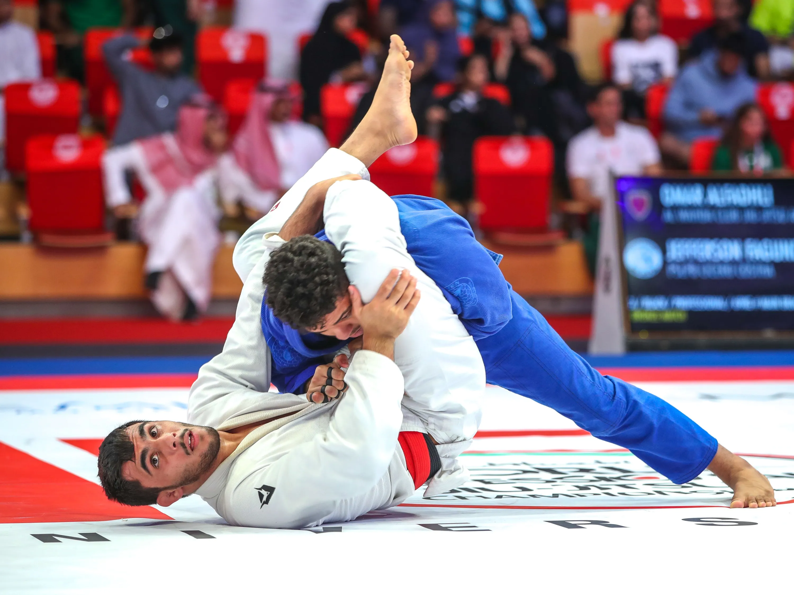 Omar Alfadli of the UAE, white, grapples Jefferson Faguindes for the bronze during the 15th Abu Dhabi World Professional Jiu-Jitsu Championship on November 9, 2023. (Photo by Victor Besa/The National)