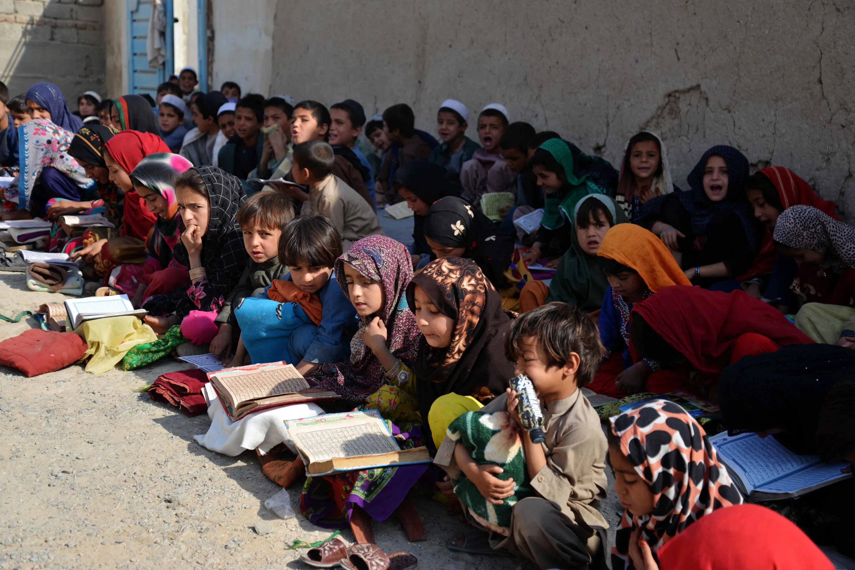 Afghan children study the Quran at an open air madrassa or an Islamic school on the outskirts of Kandahar province on October 19, 2023. (Photo by Sanaullah Seiam/AFP Photo)