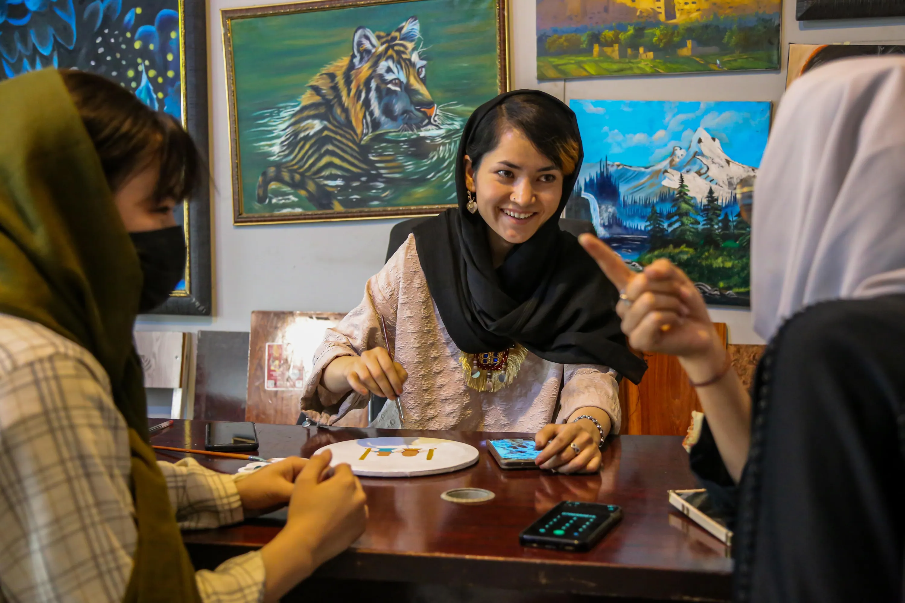 Zarbineh Khaterzai, a 27-year-old former engineering student at Kabul University who now runs a painter's guild named Honar Sera Gallery, teaches Afghan girls painting skills in Kabul, Afghanistan on November 1, 2023. Kabul girls deprived of education due to school and university closures find solace and hope in an art class. Over 30 students regularly attend the class, using painting as a means of coping and personal growth. The class is organised by Honar Sera Gallery, a painter's guild headed by 27-year-old engineering student Zarbineh Khaterzai. Khaterzai, who is optimistic about the increasing number of students, believes that these talented girls have a promising future in art. (Photo by Samiullah Popal/EPA)