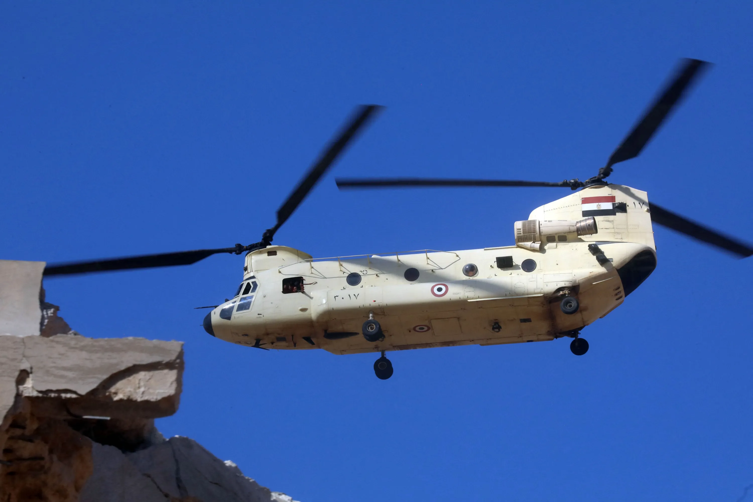 An Egyptian military helicopter hovers above affected areas following flash floods in Libya's eastern city of Derna, on September 14, 2023. A global aid effort for Libya gathered pace on September 14 after a tsunami-sized flash flood killed at least 4,000 people, with thousands more missing, a death toll the UN blamed in part on the legacy of years of war and chaos. (Photo by Abdullah Doma/AFP Photo)