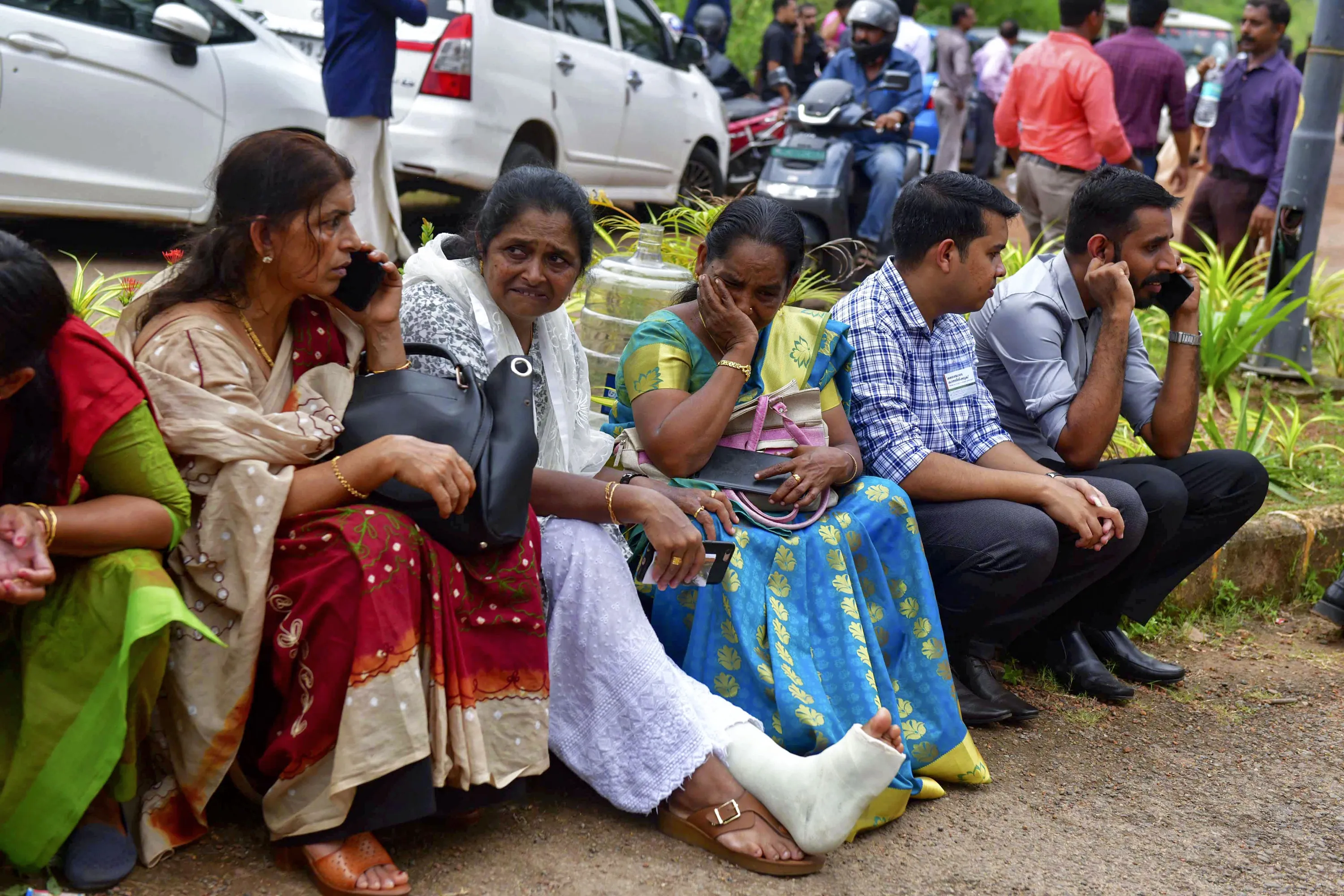 Jehovah's Witness faithful and others wait outside the Zamra International Convention Center after an explosive device blew up during their prayer session in Kalamassery, a town in Kochi, southern Kerala state, India, Sunday, October 29, 2023. At least one person died and 36 others were injured in the explosion, authorities said. (Photo by AP Photo)