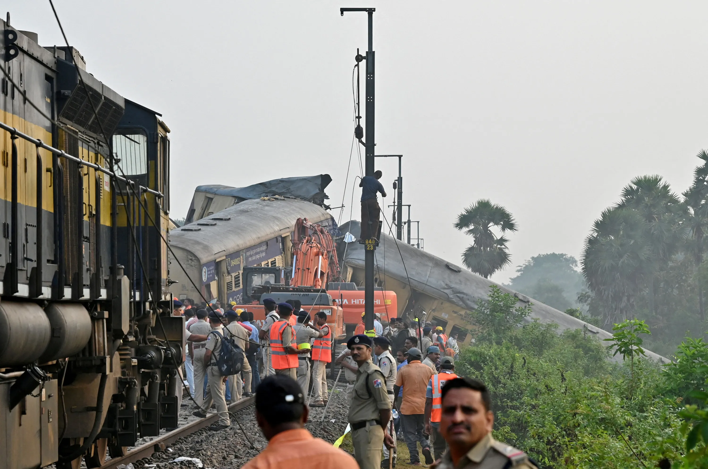 Rescue workers and police officials stand next to damaged coaches following a collision between two passenger trains in Vizianagaram district in the southern Andhra Pradesh state, India on October 30, 2023. (Photo by R. Narendra/Reuters)