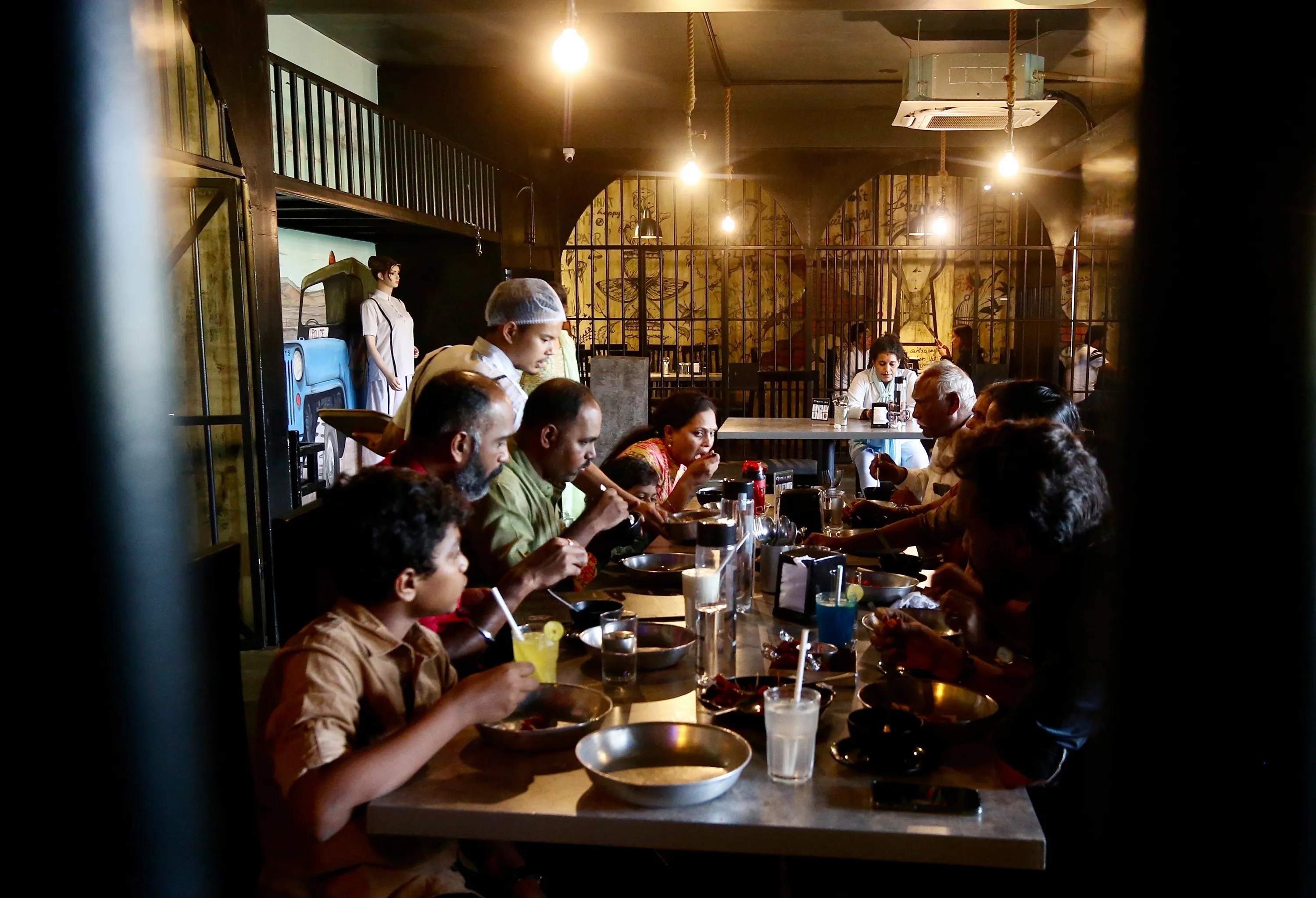 Customers enjoy dining at “Central Jail Restaurant” in Bangalore, India on November 1, 2023. People can experience dining in a prison-like facility at Bangalore's first unique prison-themed “Central Jail Restaurant” with iron rod grills. (Photo by Jagadeesh N.V./EPA/EFE)