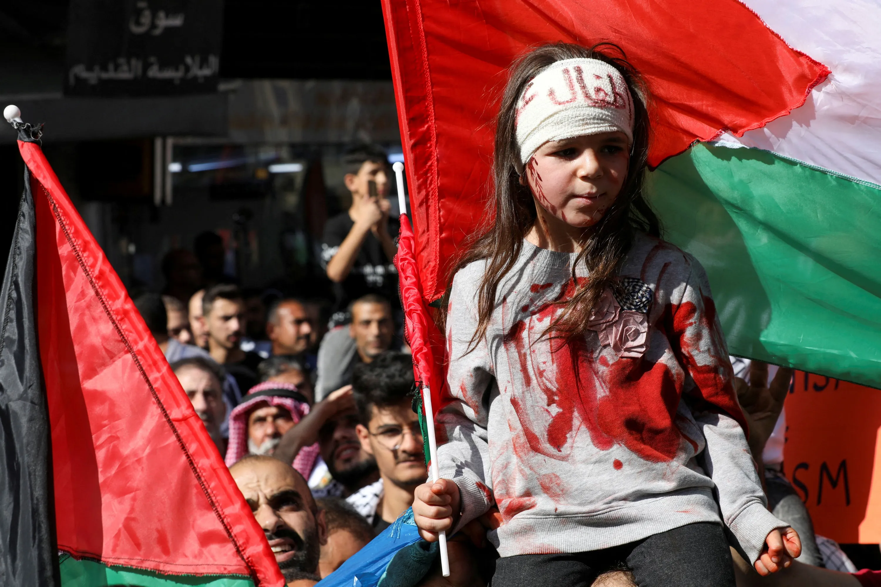 A child holds a flag as Jordanians attend a protest in support of Palestinians in Gaza, amid the ongoing conflict between Israel and the Palestinian Islamist group Hamas, in Amman, Jordan on November 3, 2023. (Photo by Alaa Al Sukhni/Reuters)